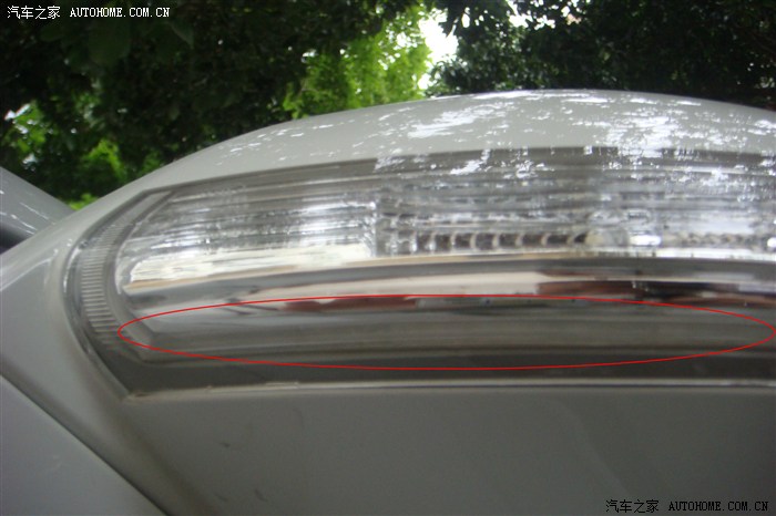 前两天下大雨了,发现后视镜转向灯下部有水珠(图中红圈区域)。