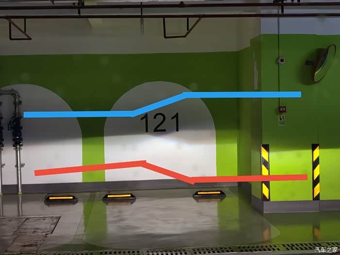 相片中与蓝色线平行的是左侧近光灯透镜切线,与红色线平行的是右侧近光灯透镜切线,切线方向正好相反。第一次更换大灯总成后晚间行车对向行驶车辆经常向我闪灯,提醒我关闭远光灯,实际上远光灯根本没开。正确的左舵车大灯近光切线是左右大灯都是与蓝色线一样的,都是左低右高,这样会车时才不会照到对向来车司机的眼睛。
