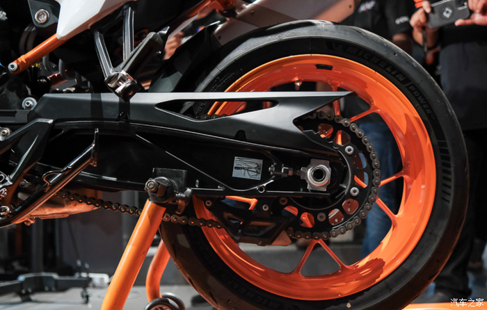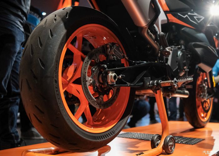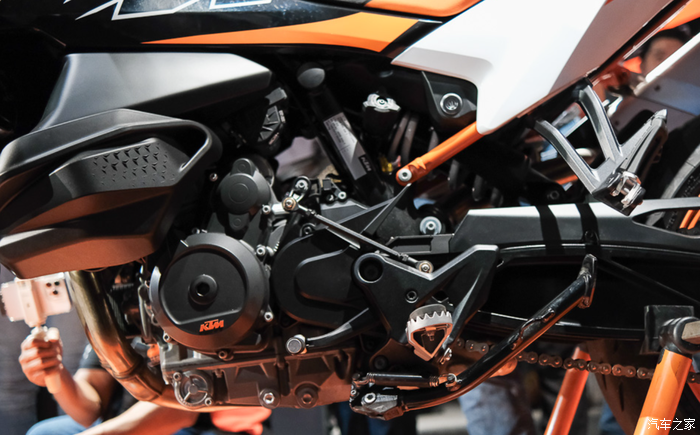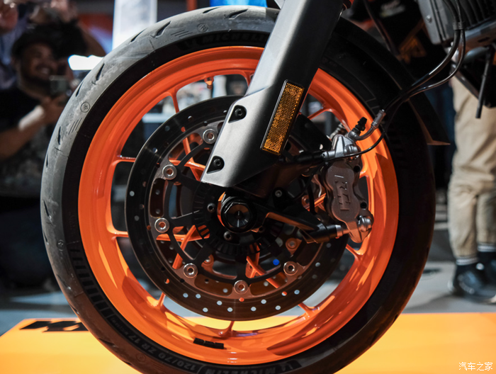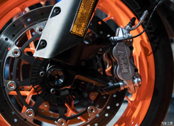 制动方面前后都是西互的制动套件,这对于习惯使用Brembo的KTM而言还是不太常见;前320mm双盘配四活塞径向卡钳,后260mm刹盘配双活塞卡钳。前后轮毂均为17英寸;整体上还是偏向于公路和一些铺装路面。