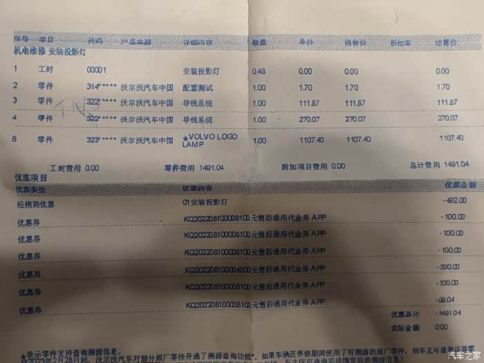由于这部分费用并不是固定支出,因此也因人而异,为了提升仪式感,今年我为爱车加装了原厂前门投影灯,加装费用为1000元整。