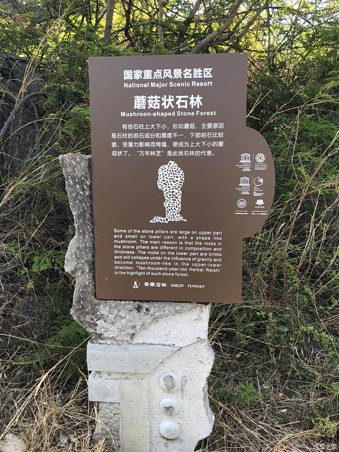石林著名景点万年灵芝位于大石林以南,处在石林溶蚀洼地南边缘高地斜坡上,石山顶上有一座上大下小高约15米的石峰,犹如一朵巨大的灵芝耸立山野之间蔚为壮观,因此得名“万年灵芝”。