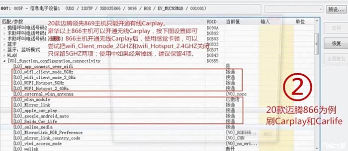 20款迈腾豪华以上的866主机可以开通无线Carplay,需要再把wifi_Client_mode_二项设置On,wifi_Hotspot_二项设置On,google Android auto设置On,Mirror_link设置On,就可以开通无线Carplay了。