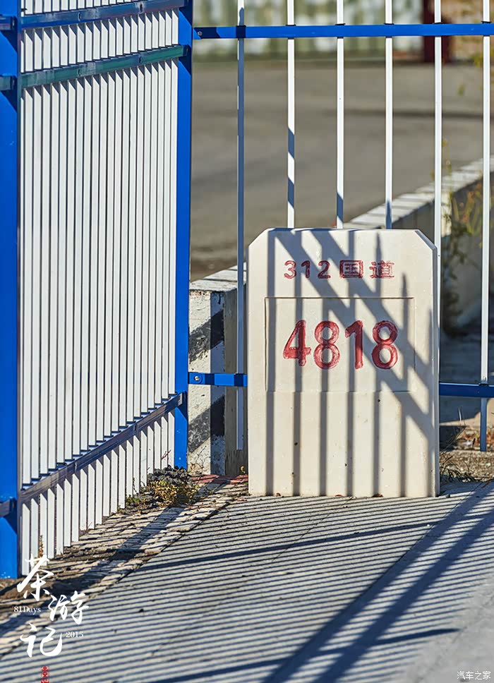 被圈起来保护的G312最后一块公里牌。围栏的外面,就是通往哈萨克斯坦的公路。