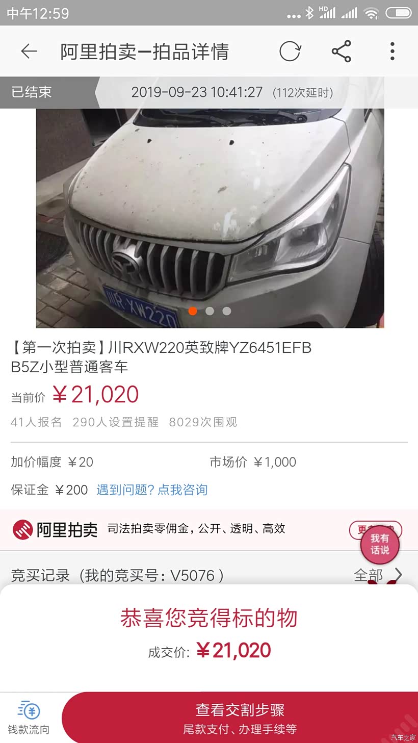 当我真在竞拍到标的物的时候呢我又感觉自己手太欠了。又有了后悔的感觉,有点不想要了。因为起拍1000,保证金才200。大不了才丢200也无所谓。同学们如果是你们的话要不要这个车呢?但是在关注了那么久的时间,心里还是喜欢的情况下还是在竞拍成功的第三天去法院交了尾款。终于见到了实车了(因为拍卖前没有去实地看车)车子外观没有事故,只有几道画痕。外观比较满意,但是车子停了几个月了电池没电了无法打火。在地图上搜了个修车店电话来搭电50块,一次启动成功