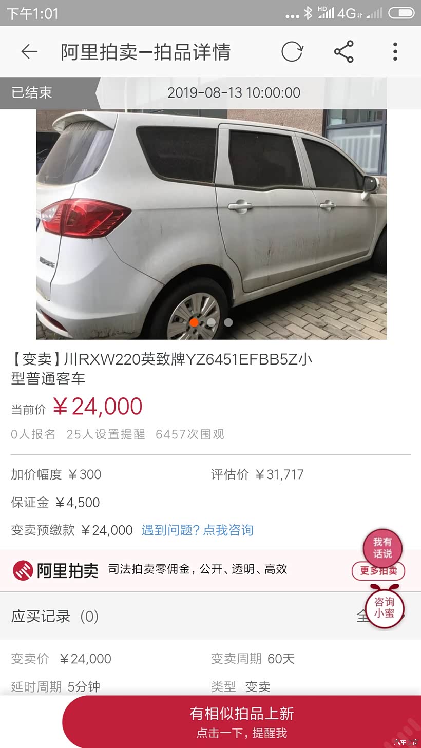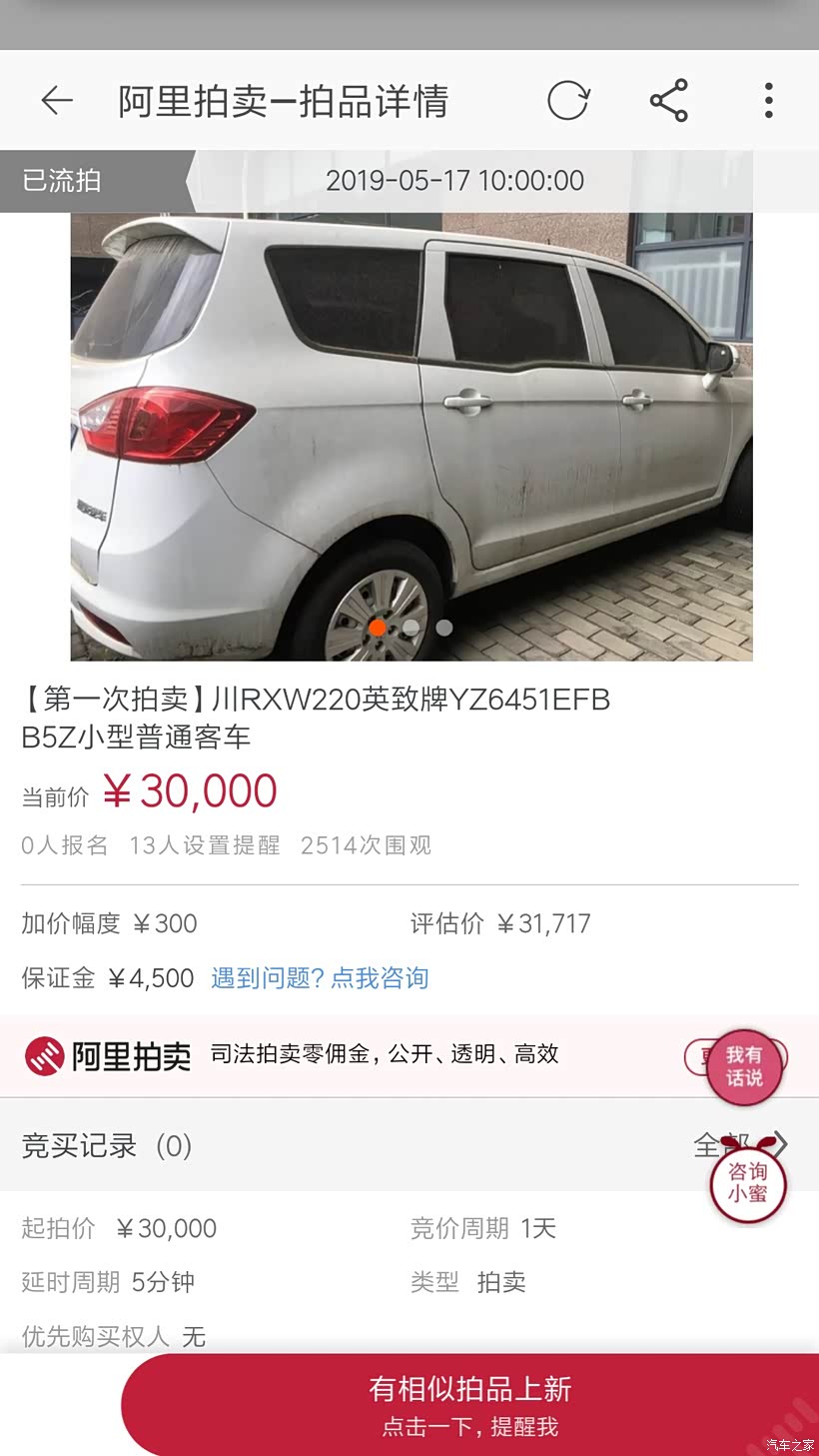 这车品牌知名度不高的国产车二手车就是不值钱啊!5月份卖到8月份都没有卖掉。又等了一个月这台车又上线了。但我让我万万没想到的是这次法院挂的价格,同学们你们也想不到吧!是1000元!是的,不要一万只要1000块就可以买台车想想都激动!心里那个美!终于等到9月22开拍那天,这天太热闹了,总共41人报名竞争太激烈了!