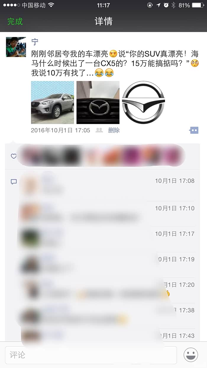 其实一开始,心里看上的新款阿特兹(真的很喜欢)。无奈领导不让,指定要SUV。没办法,这车主要是领导开的,唯有和阿特兹擦肩而过,所以才有了现在的CX5。