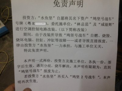 但毕竟我并非专业人士(但自问技术不比一般修车师傅差)。所以为保障自己的利益,修车前。我都要求对方先签订免责声明。
