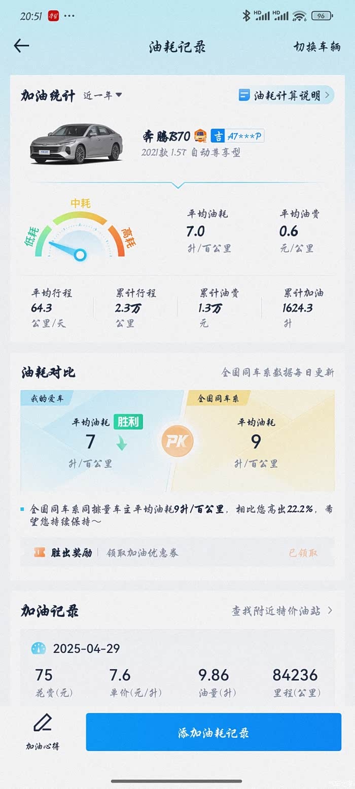 对于一台这个尺寸的中级轿车,车身重量就在1.5吨左右,这样的油耗真的让我很满意,说明它的动力组合还是不错的,与同事的雅阁或者迈腾相比,油耗反而更低一些。