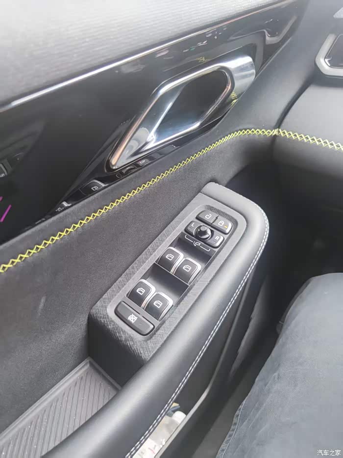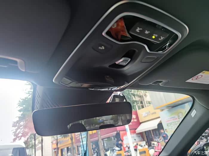 坐进主驾位,门把手一侧就是锁车键,控制车窗升降以及后视镜的按钮。抬头看去是主驾化妆镜,带小灯照明。一侧为车顶控制区,有左右阅读灯,自动阅读,SOS救援呼叫以及天窗的开启按钮。轻推一下开关,遮阳帘会先行打开,天窗开启的方法很简单,轻按开关:天窗会倾斜开启一条缝隙,用于通风。持续按住开关:天窗会完全打开。在天窗移动过程中松开开关,天窗会停在当前位置。再次按下开关即可关闭天窗。