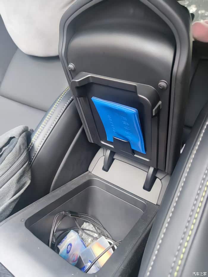 中控下方为档杆以及两个杯子收纳仓,中间扶手箱位置也可打开,增加一点收纳,底下还有一个专门证件夹。