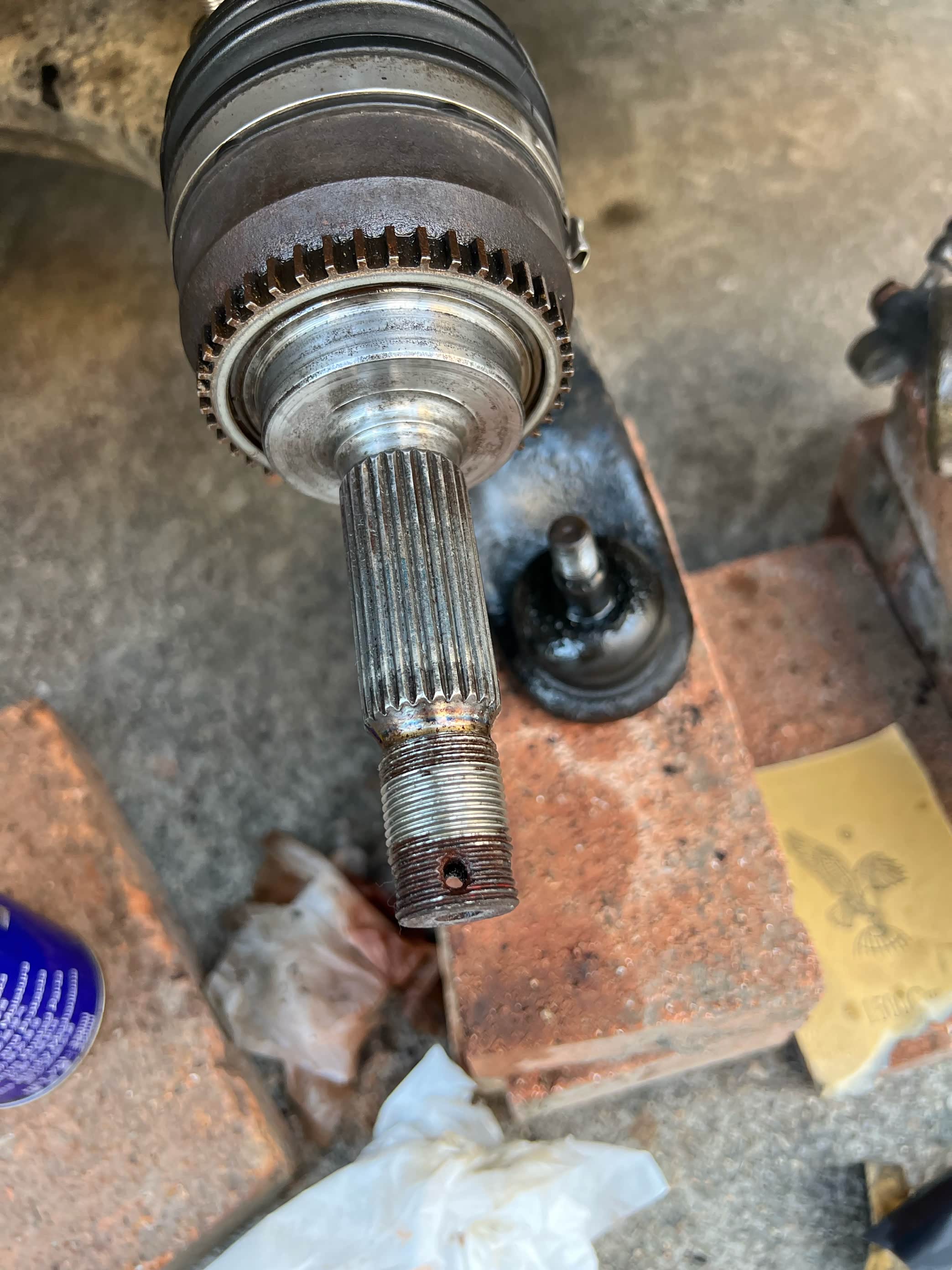 重点 :年头长的车,轴承的油封肯定有不同程度的密封不严,结果就是驱动花键进水 半轴和油封结合处全是锈,花键里面的黄油全都变成了黄泥汤……参考下图这个是锈水已经干了 如果再不处理 时间长就粘连了,到时候就拆不下来了。最后换半轴也还行不算太贵。