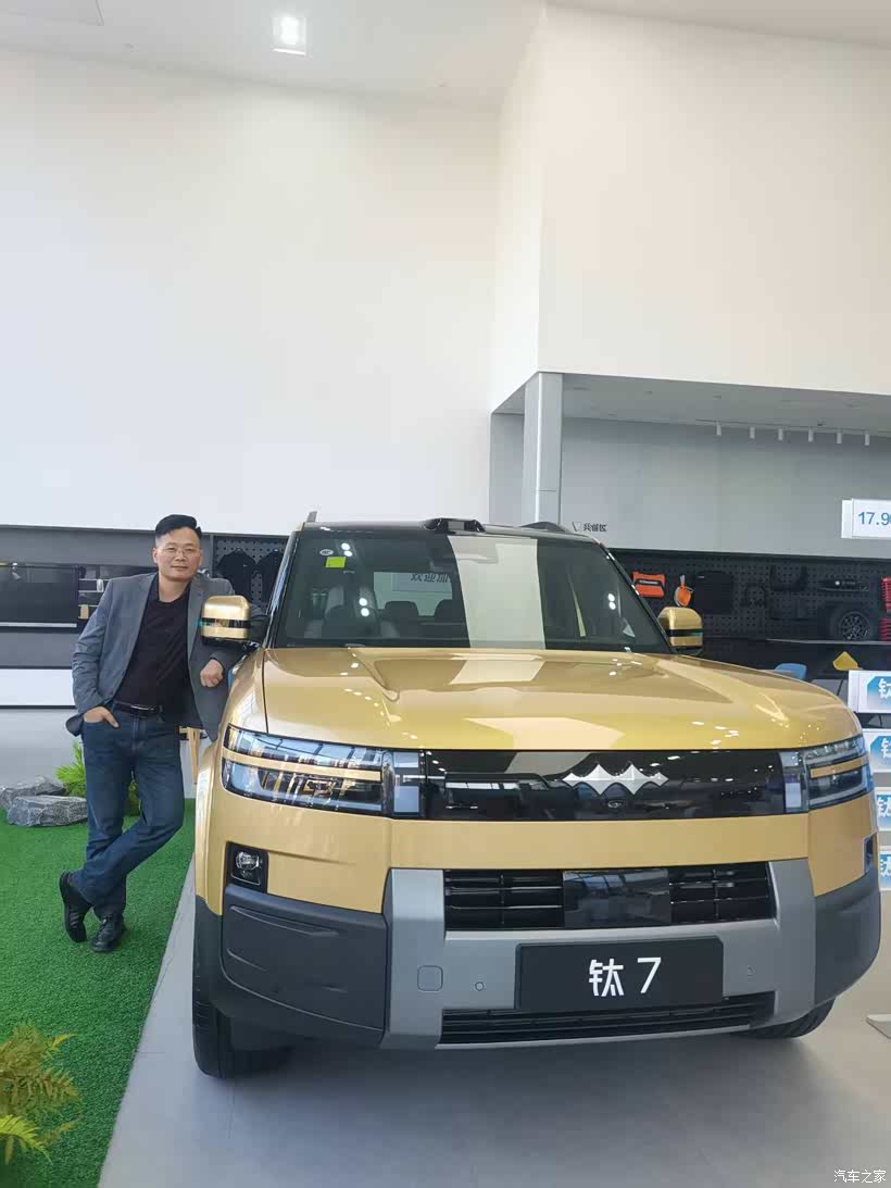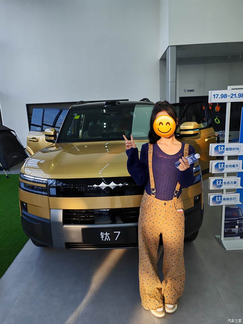 这款颜色,实话讲非常少,首次看是一位朋友一起看的,给的建议是山水绿那款,相对稳重,对于五十岁的我来说,中规中矩,没毛病,毕竟买车是家庭大事,要让家人都满意,带孩子去另外一家四S店看的时候,突然发现孩子站在这辆旭日金颜色的车旁,那天穿的衣服裤子是浅黄色的,颜色与车出现在镜框中,看上去无比的和谐,恰好展车就是顶配,再定的话需要至少一个月,果断与销售说就要这辆展车了,虽然价格谈不下来,但是马上可以拿到车,就这样当场敲定交钱,第二天拿临牌提车。