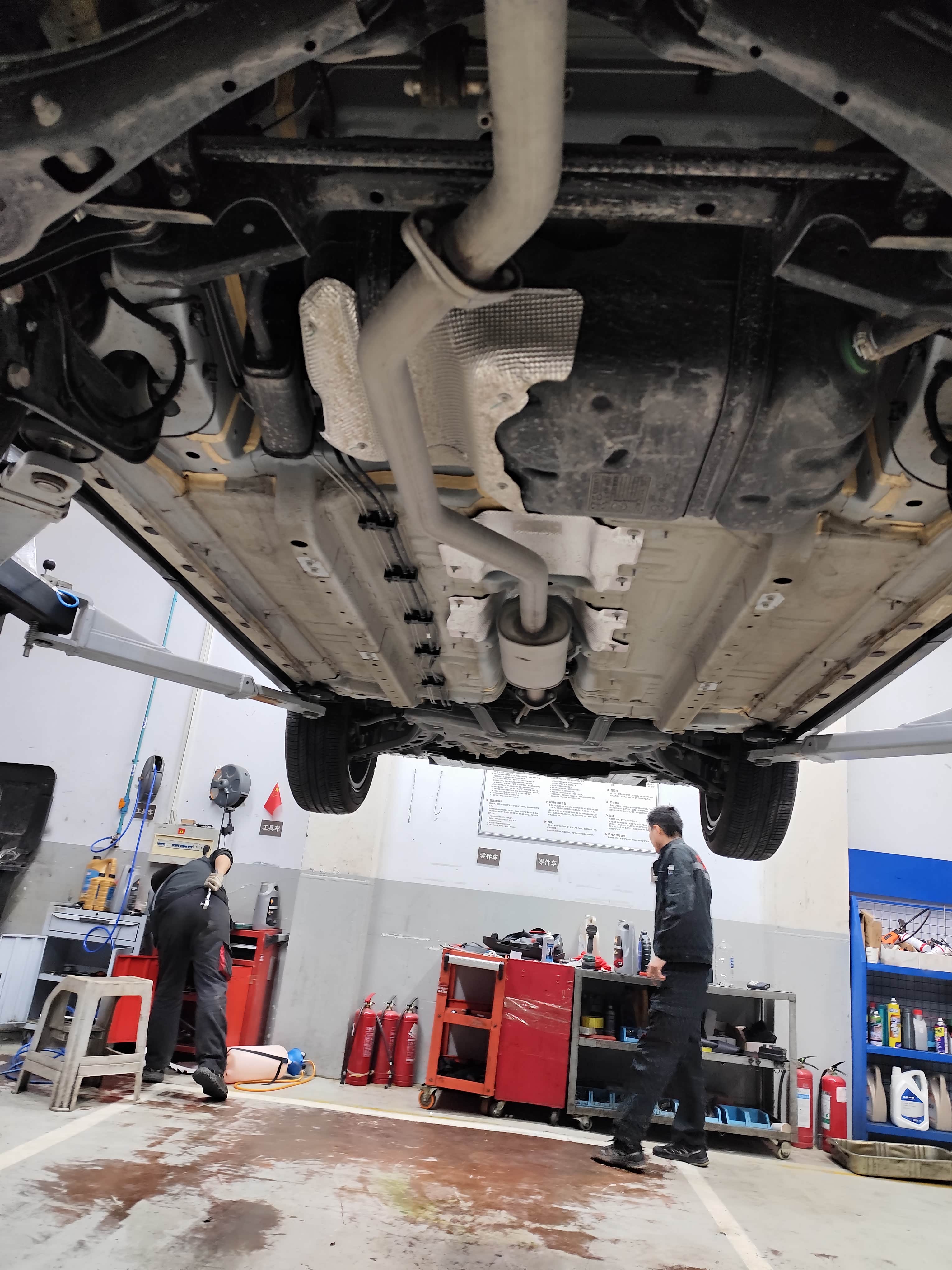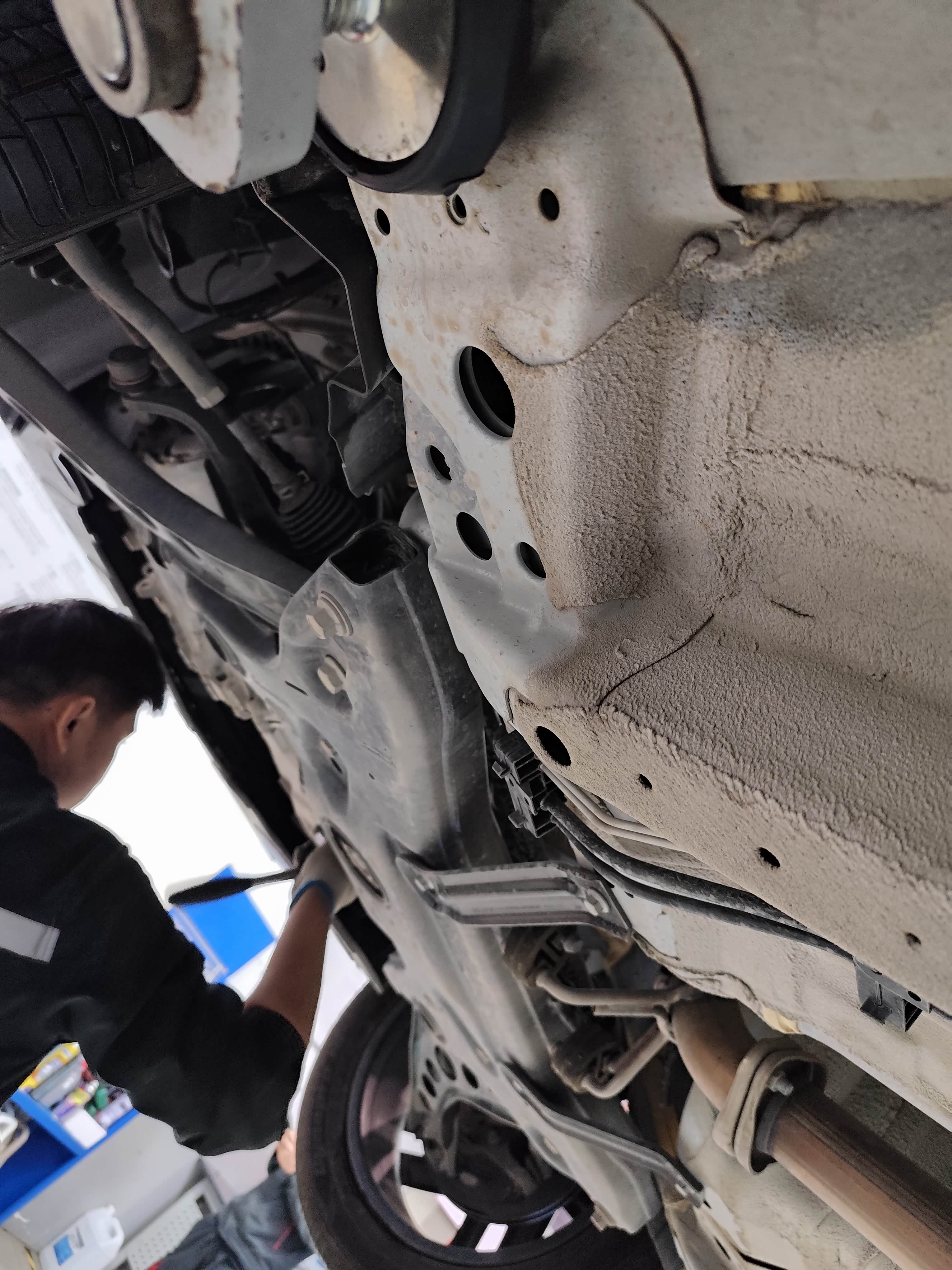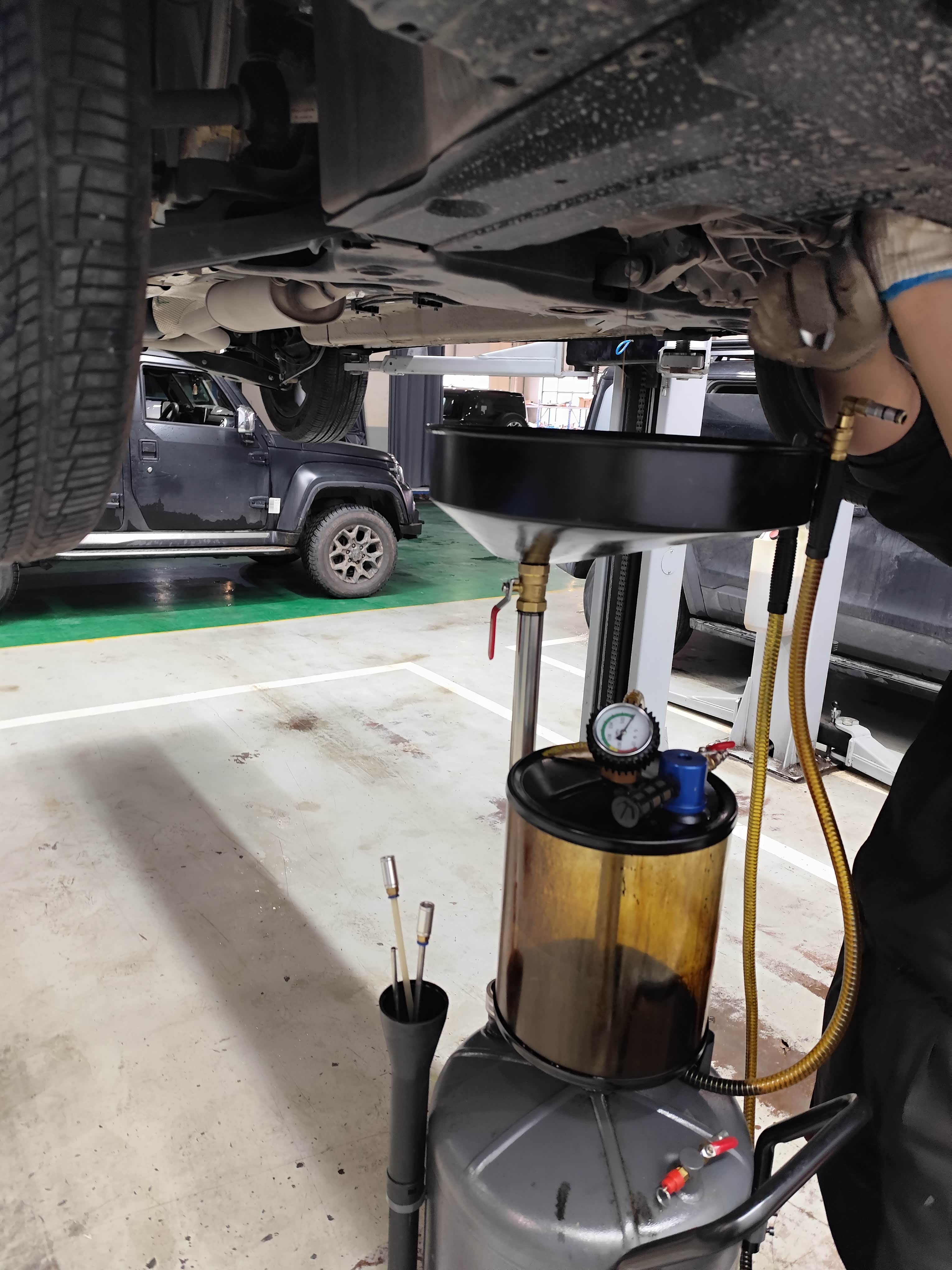 1. 举升与放油: 车辆被专业举升机平稳托起。技师首先找到发动机底部的放油螺丝,使用专用扳手将其缓缓拧开。瞬间,一股已经变得黢黑、粘稠的旧机油如瀑布般倾泻而下,精准落入废油回收桶中。技师在一旁解释道:“机油在高温高压下工作,时间长了会氧化、混入金属磨屑和积碳,清洁和润滑性能都会下降。定期更换,就是对发动机最好的保护。”车子虽然行驶里程不够,但是时间到了,也需要及时更换。