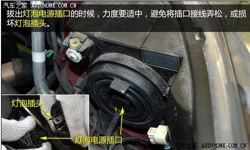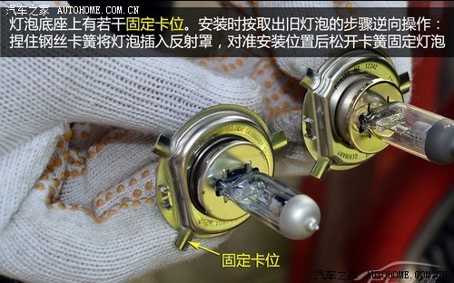 第三步:将灯泡从反射罩中取出。灯泡一般是由钢丝卡簧固定,某些车型的灯泡还带有塑料底座。
