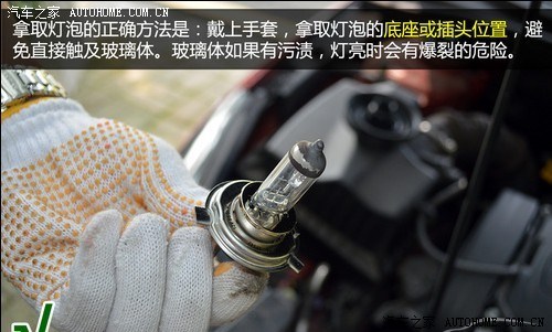 在安装灯泡的时候,手指不要直接触及灯泡玻璃体。这是因为灯泡内部有气体,哪怕有一丁点手指上的油渍粘附在玻璃体上,都会缩短灯泡的使用寿命,长期使用可能会有爆裂的危险。