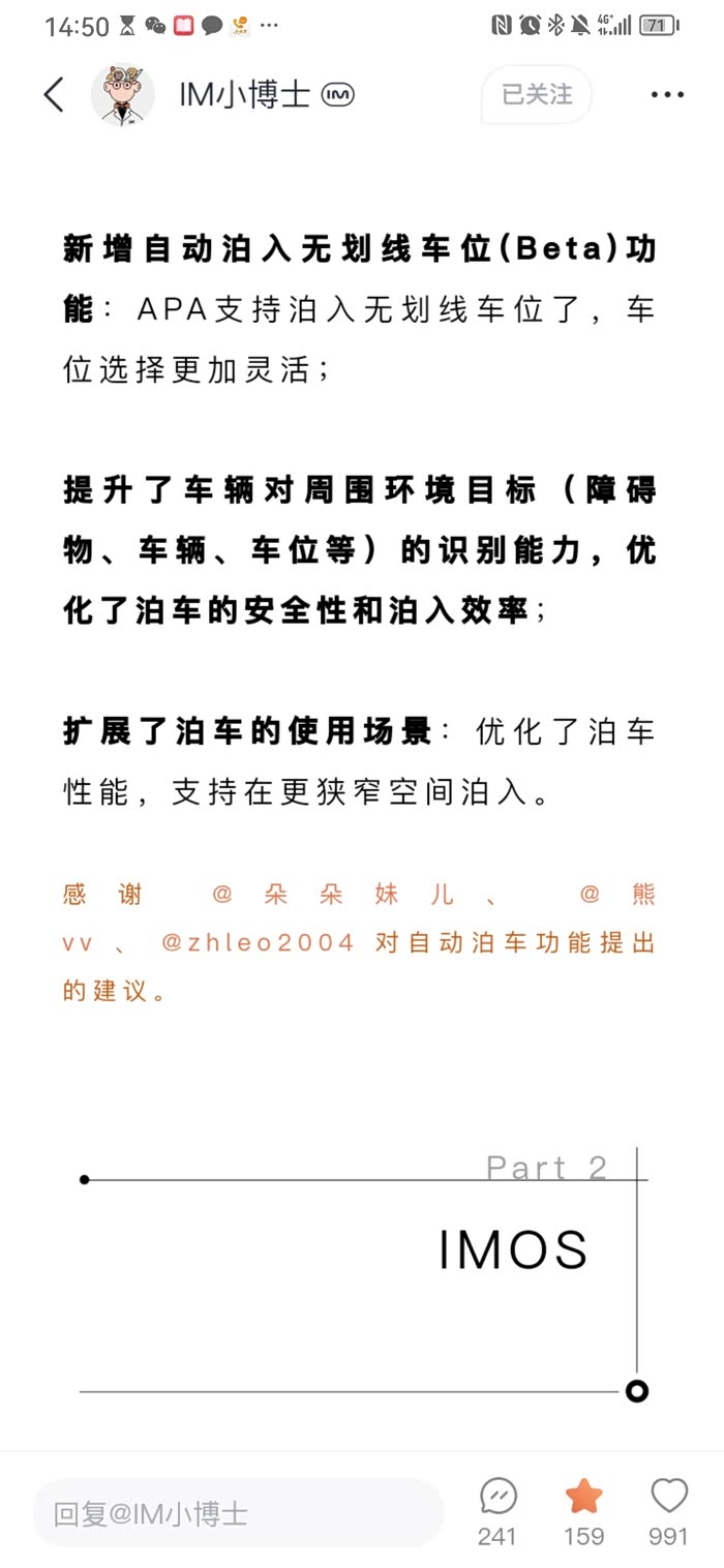 之前还一直在开玩笑,像我小区车位都没有划线的,要使用自动泊车功能,还要自备油漆,在想要停车的地方先划上线,没想到自动泊入无划线车位的功能悄然上线了,亲测好用,现在只要有足够位置,就能使用自动泊车,而且现在自动泊车是越来越流畅了,遇到过稍复杂的位子或边上有车开过,以前都会报环境复杂就退出,但现在都能从容应对,是我使用最高频的功能了,比我自己停优秀太多了,现在成功率几乎是百分之百了。