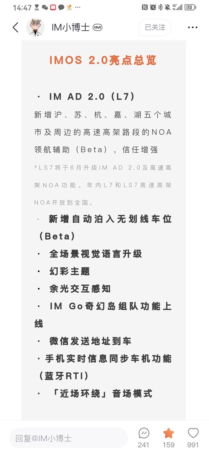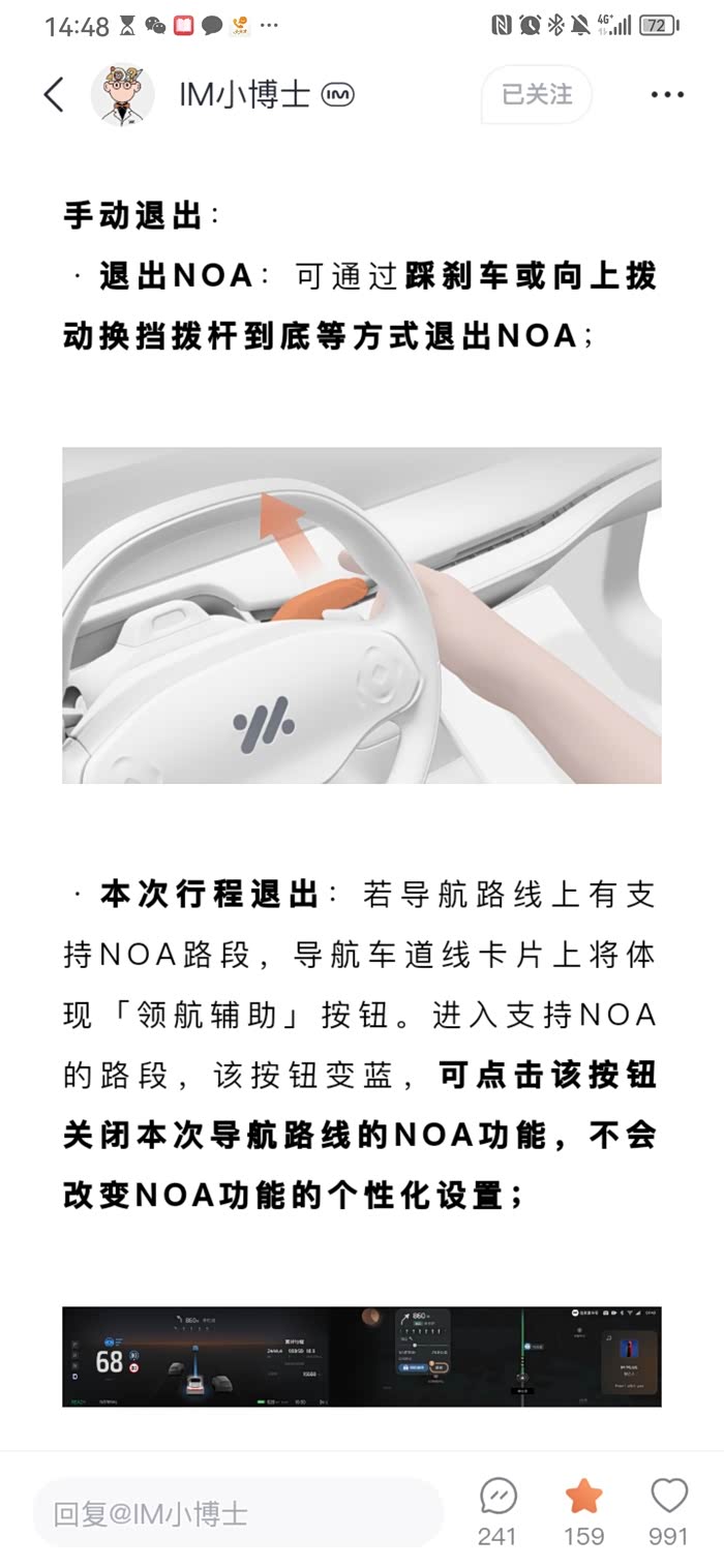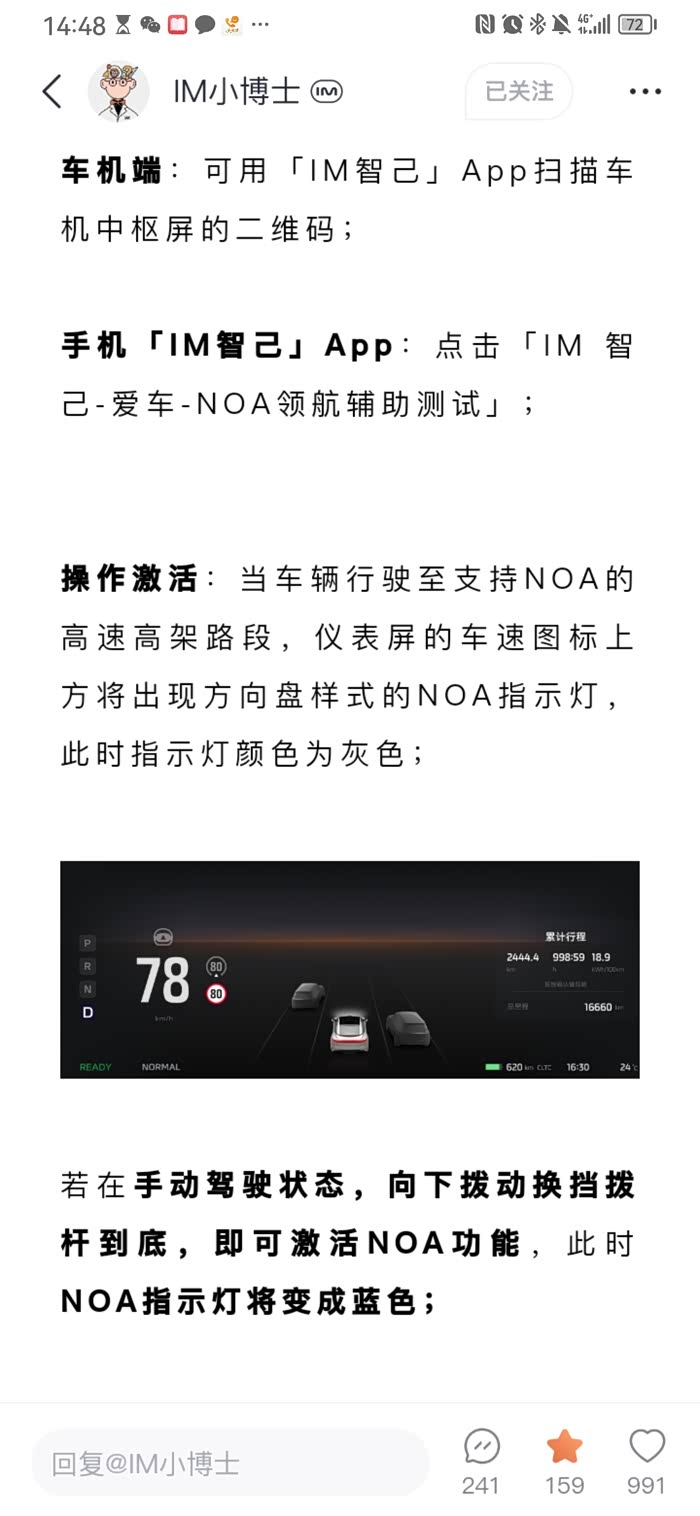 NOA领航辅助应该是这次版本中最大的亮点,也是大家最期待的功能。就像涛总说的车机可以OTA,但人生不能OTA,所以智己对该功能的开放是相当谨慎的,经过多轮的测试及开放给部分车主的内测,确保安全后才正式开放,所以也让大家等待了蛮久时间了,和这次IMOS2.0一同发布,也是在小长假前夕开放,让好多车主出游轻松了很多。篇幅有限,关于NOA详细的介绍就不在这展开了,之后会有NOA体验的专题报告。这里只想说一下NOA的整体表现还是非常出色的,变道果断,进匝道顺滑,真的像人一样在开,而且在变道或避让大车前主屏会有提示,让你心里提前有准备,信任增强也在时刻提醒你当前环境,当环境较复杂时建议人工接管,只要熟悉了NOA的边界,真的能让开车轻松很多。