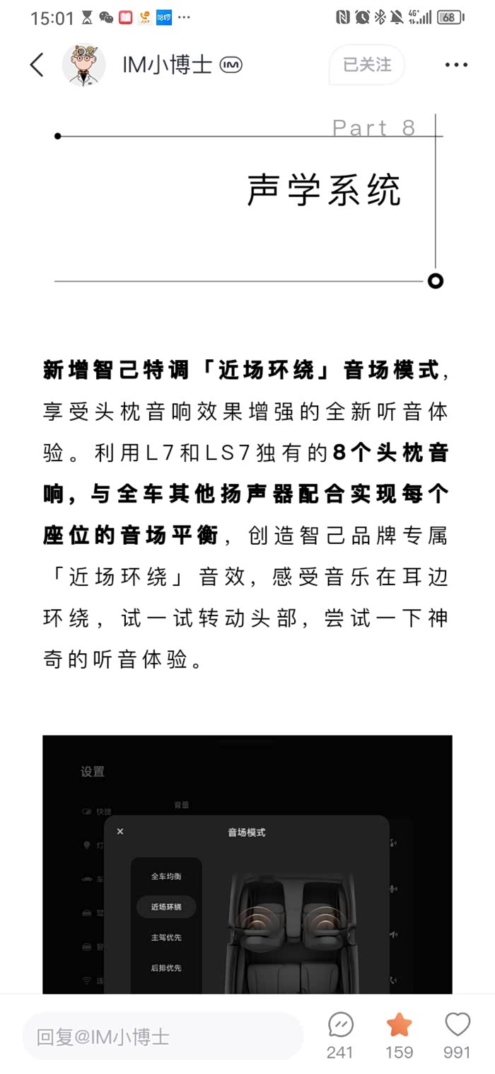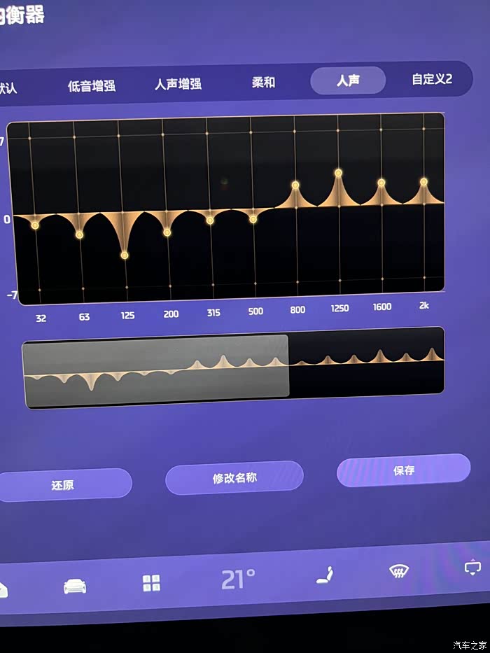 这次新增的“近场环绕”音场模式彻底解放了8个头枕音响,让人更加沉浸式地欣赏音乐,这里附上车友大神提供的均衡器的调节方案,亲测效果明显。智己还很贴心地提供了近场环绕歌单。