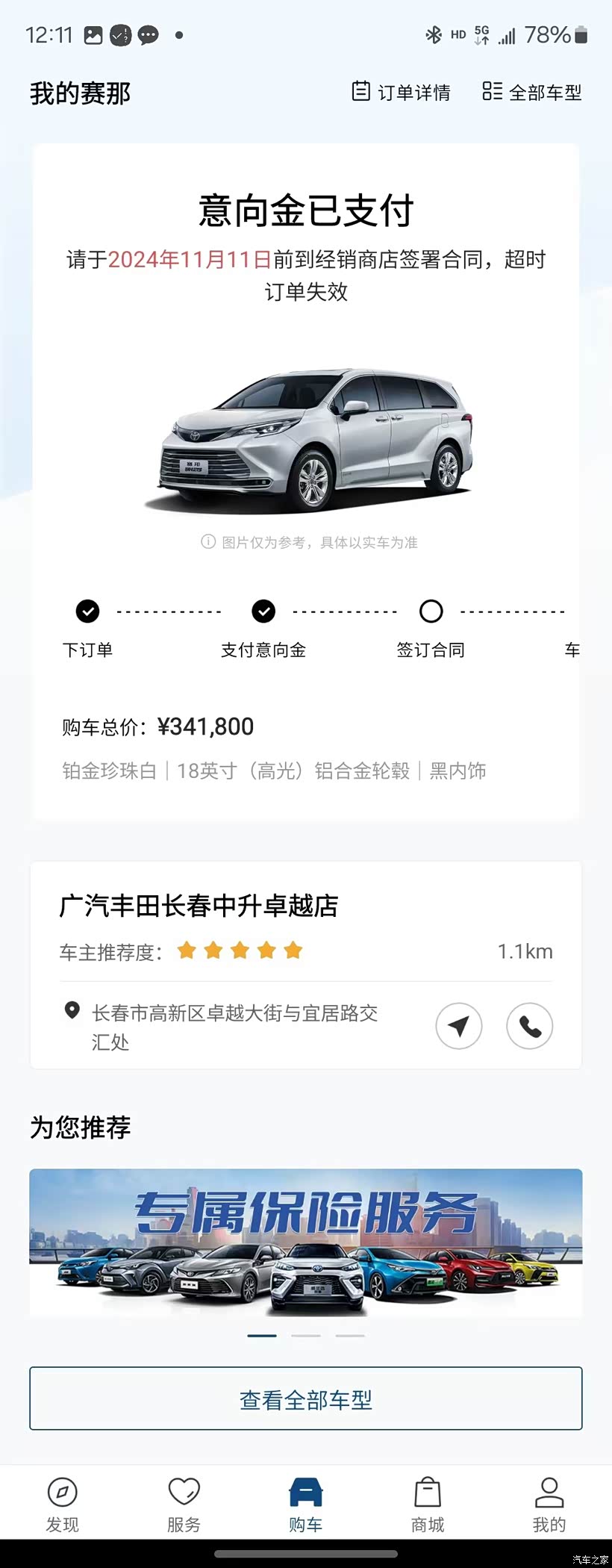 落地价(含购置税、保险):341800 元