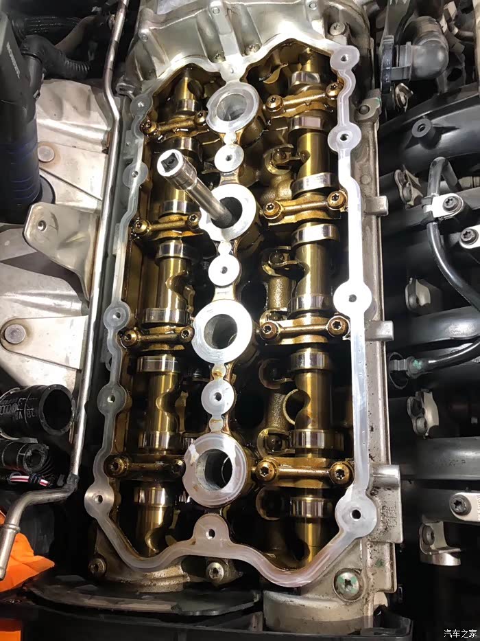 更换油水分离器,稍微有点渗油更换气门室盖总成,有人说为啥不单独换个垫子?要彻底解决这个问题其实建议更换总成,原因很简单年份旧了,气门室盖其实是有略微变形的,就算换了新垫子也不会很贴合往往开不了多久又不行了,还白白浪费了工时,本着一次性解决问题的态度一步到位最为稳妥。拆开盖子发动机状态非常好,点个赞。