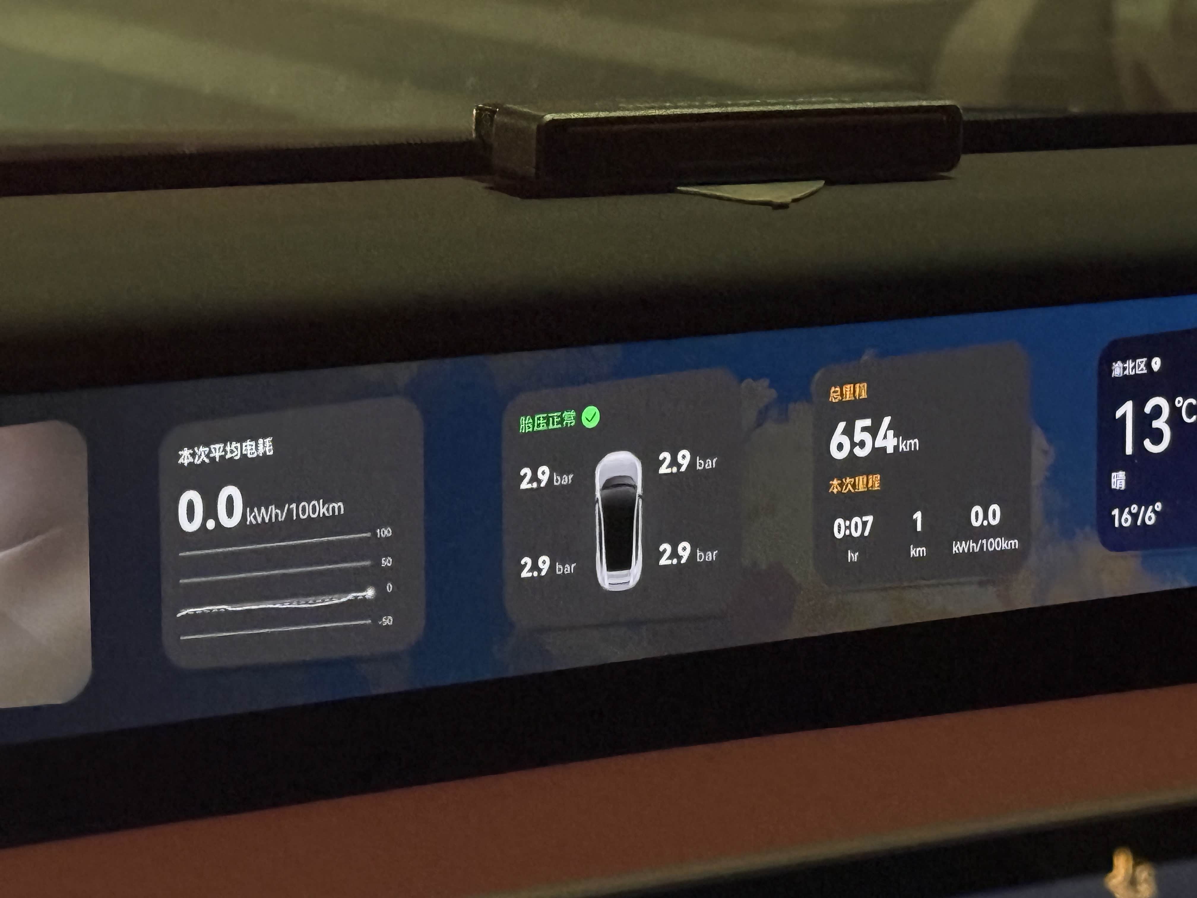 另一个在冬天特别好用的,是前面那块超长的远端屏。冬天路上容易起雾,光线也常常不好,驾驶时需要更专注。这块屏幕把车速、导航、歌曲这些最关键的信息,都直接放在我正前方的视野下方。我不用扭头去看中控屏,眼睛的余光一扫就能看清,视线离开路面的时间大幅缩短了。尤其是开导航的时候,下一个转弯箭头、车道信息就明明白白地显示在眼前,在雨雪天气或者陌生的夜路上,能给我带来很强的安全感和便利性,让我开车更专注,也更放松。