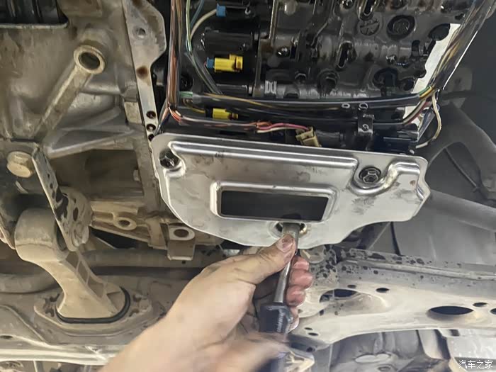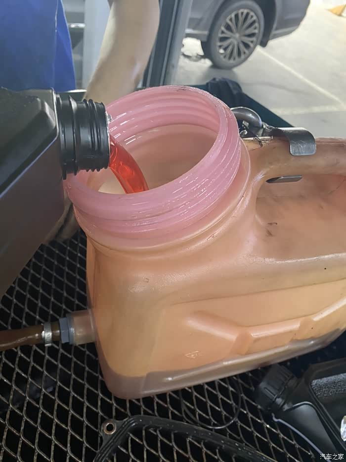 放下来之后将容器挂到机场盖上运用流体的重力效果将新油加入变速箱内,那这个过程需要10到15分钟,等待容器内的新猷全部加入完毕,我们只需要将软管拆除,由于加注口高度的原因,即使管路拆初新油也不会漏出来。设计非常的巧妙,然后我们只需要锁紧固定螺丝,那么我们变速箱油了,更换就基本宣告结