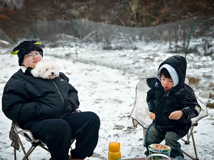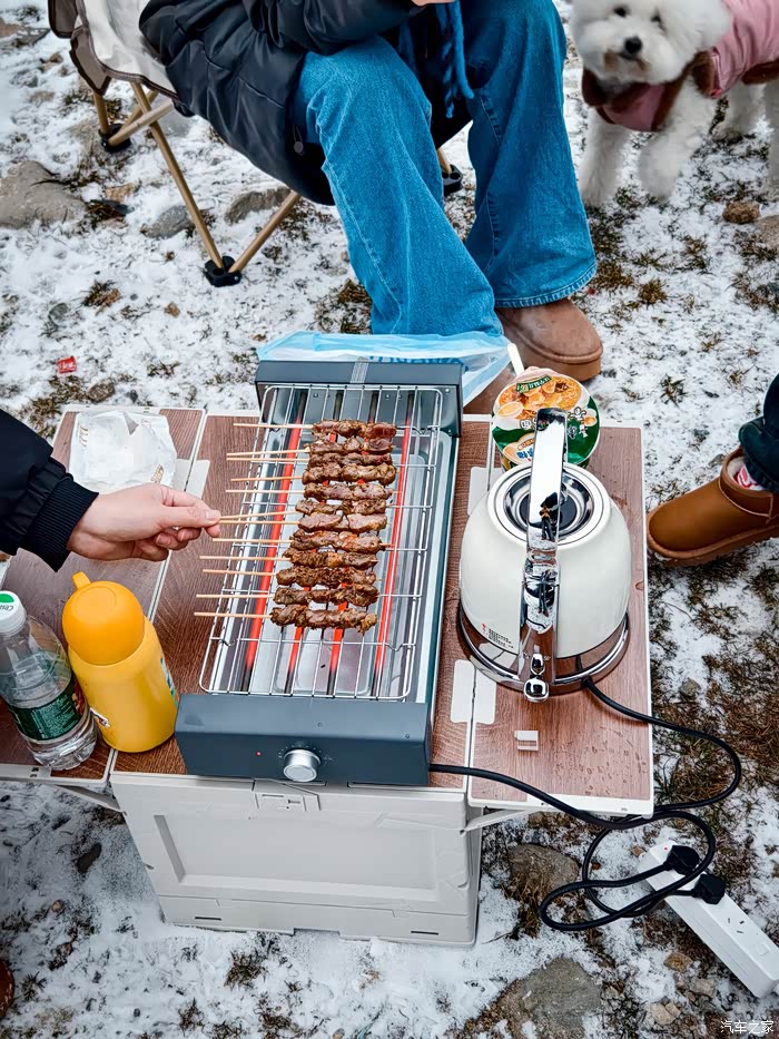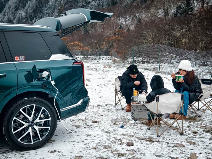 玩闹了好一阵后,肚子也开始咕咕叫了起来,这可难不倒我们呀,毕竟咱开的可是传祺ES9呢。我们把车开到了雪山下一处空旷又安全的地方,利用它强大的外放电功能,