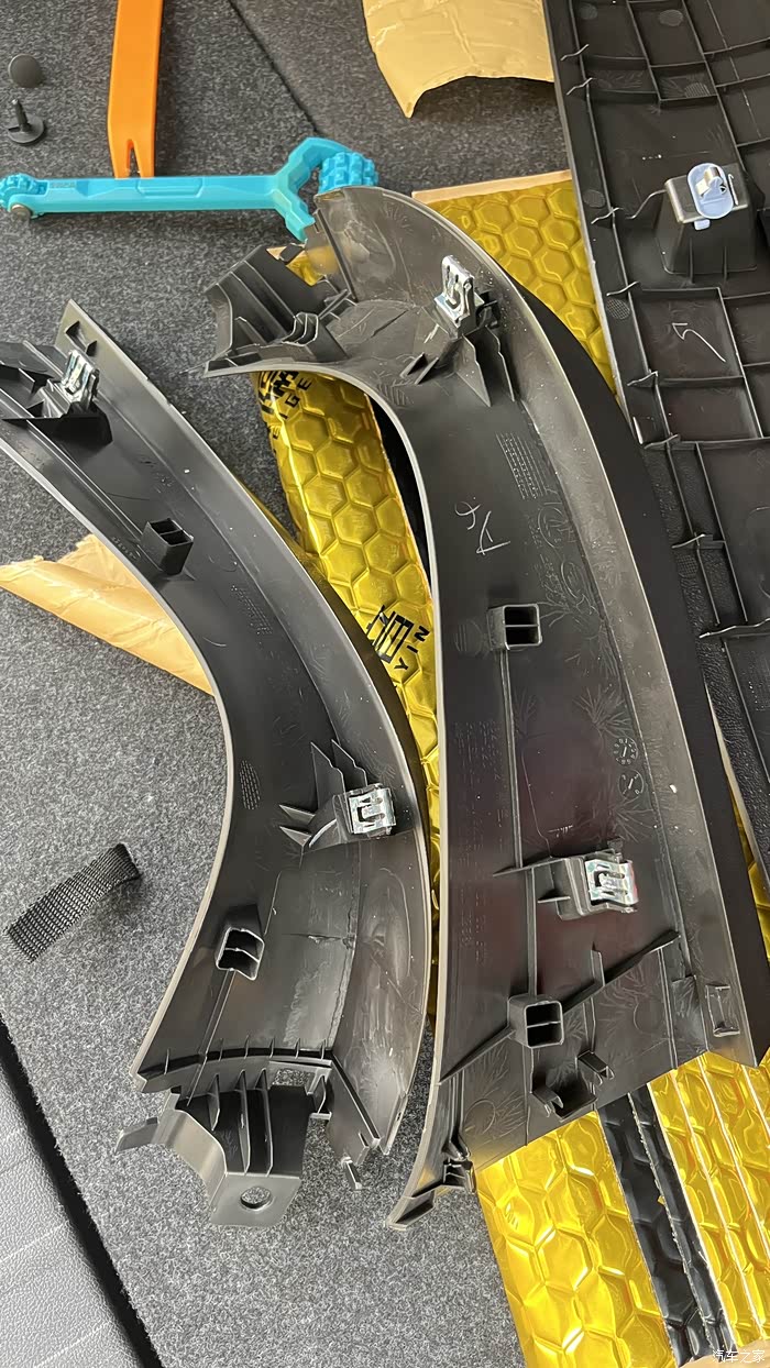 车门饰板的撬开方法和后备箱一样,找到一个位置,用平翘板先撬开一个卡扣,其他的依然是大力出奇迹。