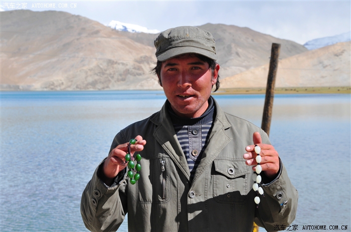 在喀拉库里湖边遇到一位卖玉石饰品的柯尔克孜族老乡,一阵交谈,买下了他手中的玉石手链,据他说是和田玉做滴,比巴基斯坦玉石好。管它真假,也不能当真,纪念品而已。