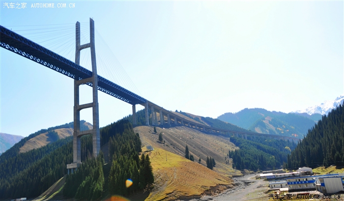 果子沟特大桥是赛果高速公路项目的控制性和标志性工程,全长700米,特大桥跨径330米,主塔高度分别为209米和215.5米,是目前国内首座双塔双索钢桁梁公路斜拉桥,也是新疆最高的公路大桥。