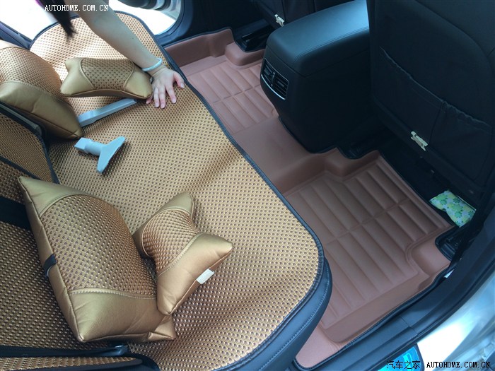 (后排,坐垫送的头枕和腰垫,座椅下面放的炭包,后排坐垫上那两个是吸尘器的接头,媳妇还在忙乎……)