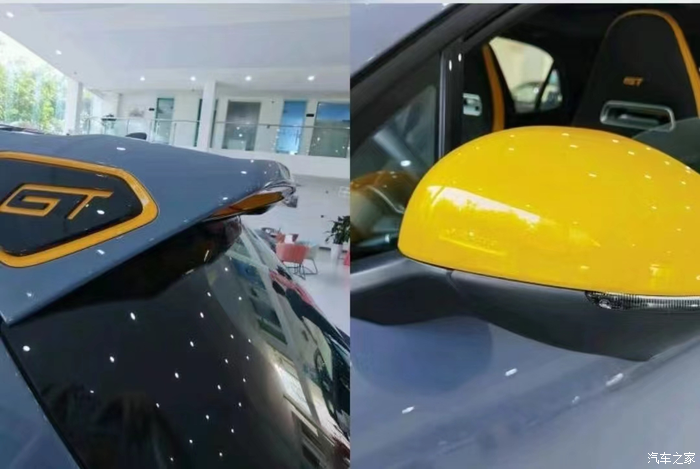 去4S店真的是一眼就喜欢上了这款车,外观看着蛮像家里那台SUV的,铠甲灰的外观颜色很特别,还有轮毂、后视镜以及尾翼处鲜明的黄色点缀,个性十足啊~