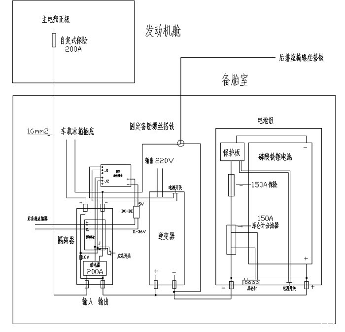 1、手机蓝牙控制逆变器开关,并控制应急启动开关,用副电瓶启动汽车也不需要打开后备箱底板。
