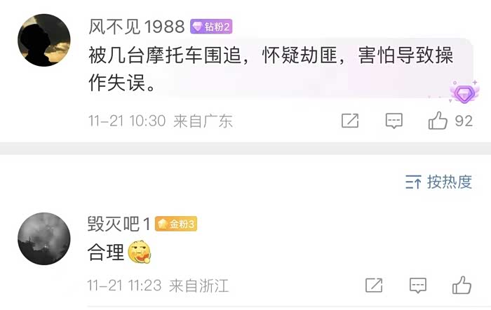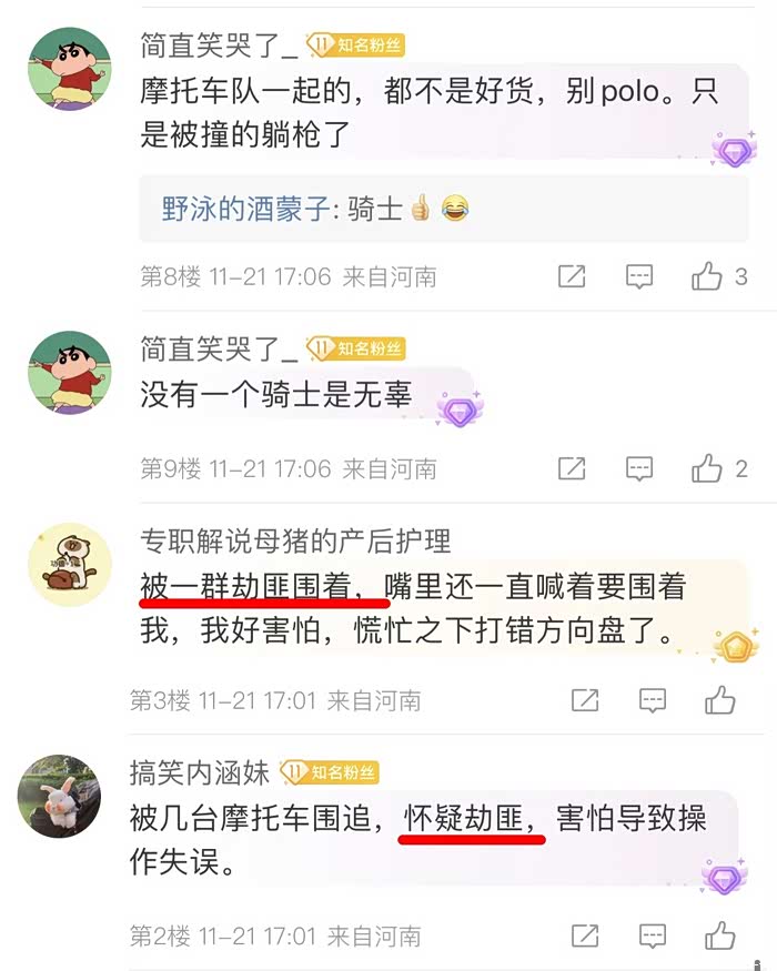不过有意思的是,虽然被撞的是摩托车,但最后在网上被网暴的却是受害者。网友们甚至说这些摩托车驾驶者是“劫匪”,还有人为这个polo车主脱罪支招:“就说是因为劫匪打劫,我一时害怕导致误操作。”