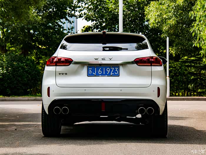 车身侧面的线条相对来说比较柔和一点,SUV走遛背设计的很多,不过在我看来,VV5的这种还算挺漂亮的,没有用当下流行的悬浮车顶也能营造出漂亮的车身侧面线条。19寸的轮毂相对这么大的车子来说,已经算很大了。而车尾在我看来,就是双边四出的排气筒是最大的亮点,还有熏黑处理的尾灯,处处都透露出运动的气息。
