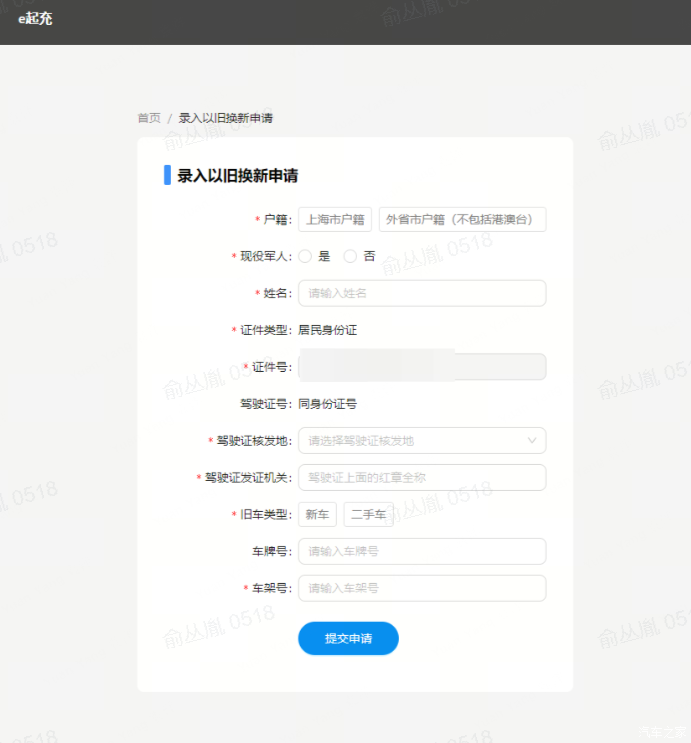 2、申请上海新能源车专用额度,到e起充微信小程序里申请,个人用户通过以旧换新方式购买纯电动汽车的,可以申领专用牌照额度;我是符合拥有“非营业性小客车”(蓝大牌)和“新能源小客车”(绿牌、新能源专用牌照)的个人用户,转让或者报废名下“新能源小客车”,并且通过以旧换新方式购买纯电动汽车新车,所以可以申请上海新能源车专用额度;