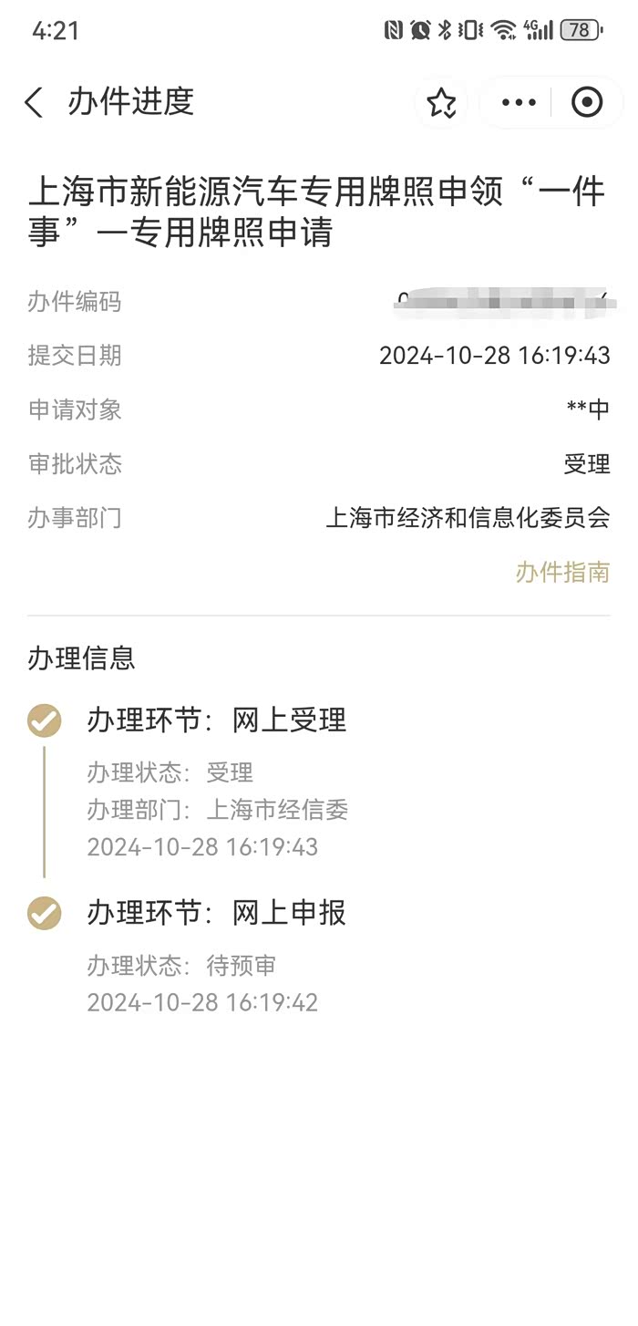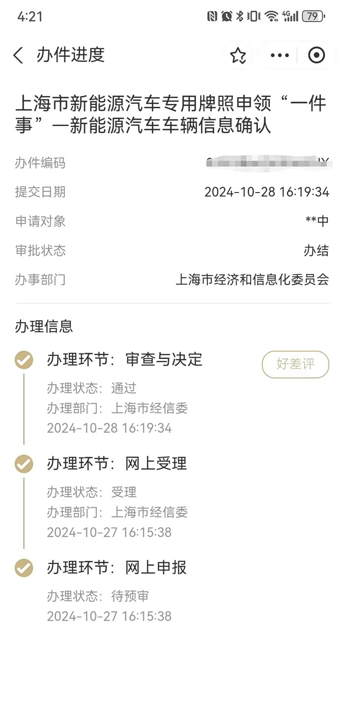 4、上面123都完成后,到随申办我的里面去确认下上海市新能源车专用牌照申领“一件事”相关信息;周一厂家就通知缴纳首付款和签贷款合同,预计3个工作日左右银行放款、call车、发运,车辆到后pdi、刷机等等,预计下周就能交付。从打算置换到现在等着提车,时间跨度不是很长,大概3周多点时间,主要是我二手车交易和上海新能源车专用额度申请耽误了几天时间,要是新买的话要快一点。