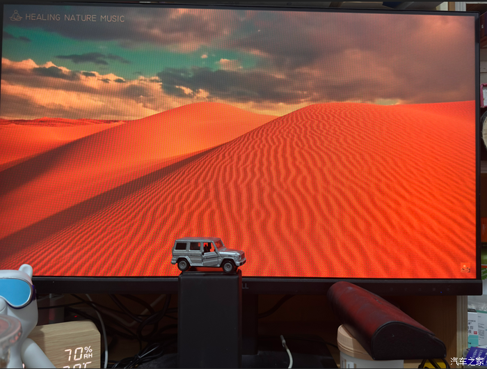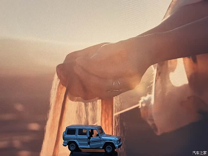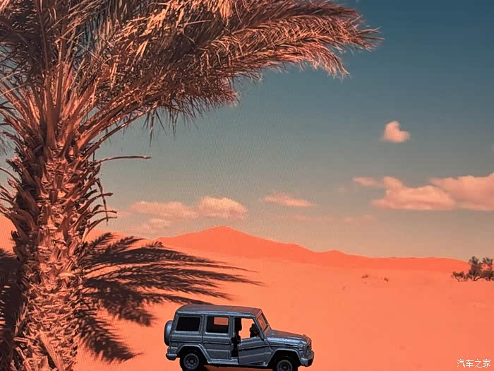 拍着拍着,我又想到了沙漠。对男人来说,提到大G,就会联想到无尽的黄沙和风。于是我打开电脑,找了一段旅行视频,画面里是夕阳下的沙丘和一双捧起流沙的手。那温柔的光线,透过屏幕打在桌上,我把小G摆在前景,透过镜头按下快门。就在那一刻,车模和背景融为一体——那仿佛是我心中最真实的一幕:一个梦在沙漠里静静地行驶。