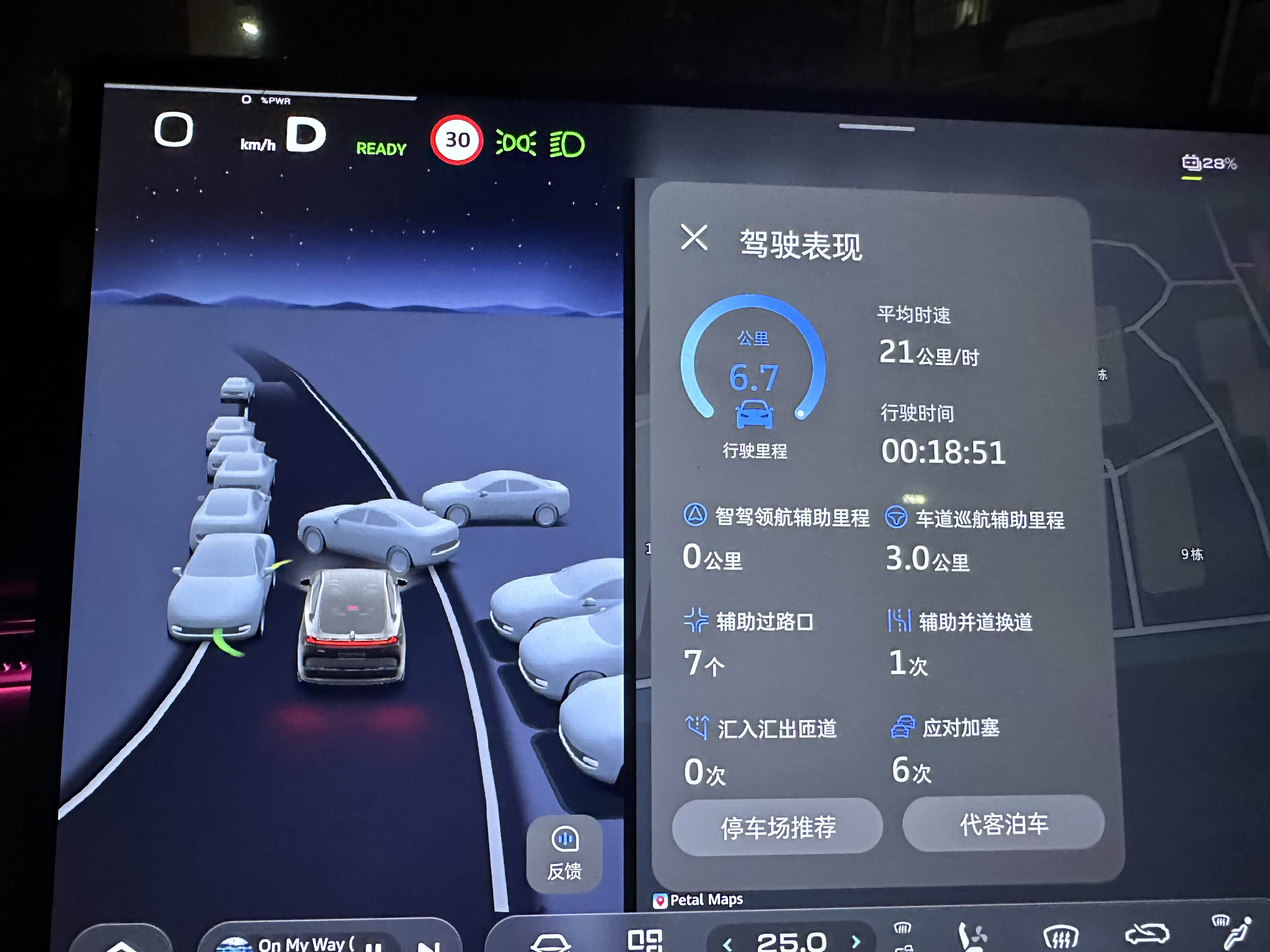 在高速路段开启智驾后,最让我惊叹的便是其自动上下匝道的能力。系统会提前至少两公里就开始规划路线,平稳地并入最右侧车道。进入匝道时,它能精准地感知弯道曲率,并以非常拟人化的、平稳的速度通过,完全没有突兀的转向或制动,车身姿态稳定得让人安心。这种“一切尽在掌握”的从容感,极大地缓解了长途驾驶的疲劳。