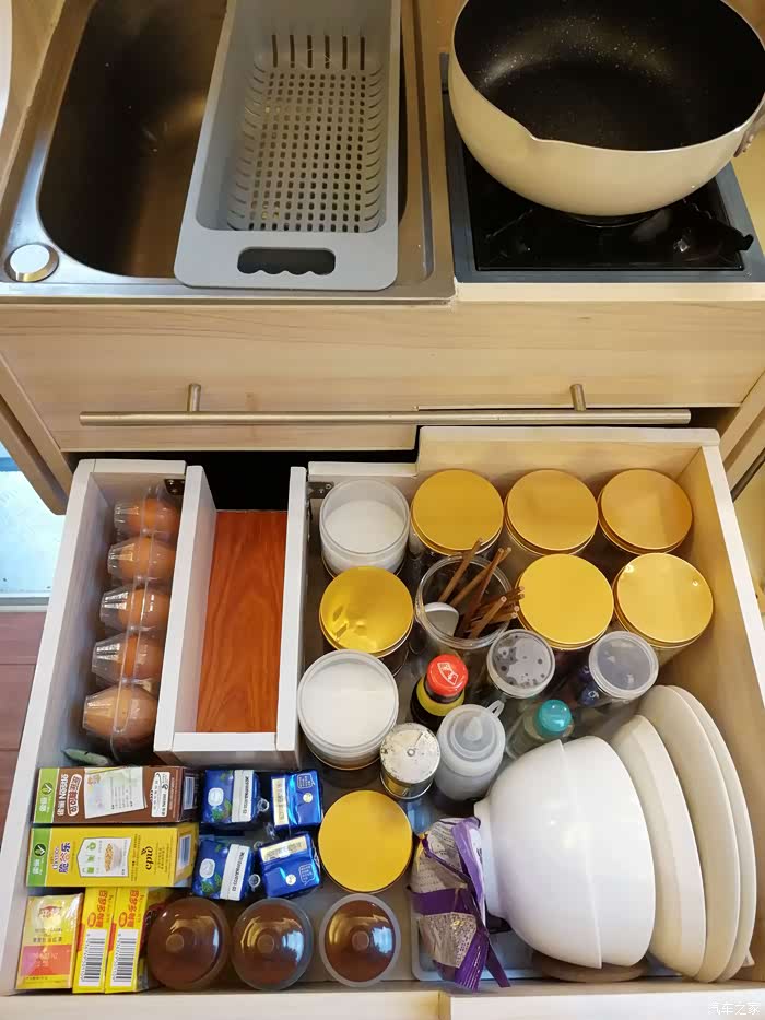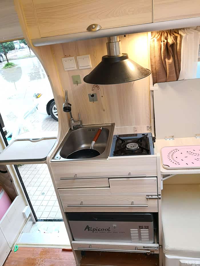 9,外置厨房,这个也是每家都能装,但是我一直都劝别人别装这个东西,在我改装厨台之前,我也不愿意去车外做饭,风雨蚊蝇各种情况都会你失去“野炊”的兴趣,看似很有科技感的“抽拉”并没有变形到什么齐备的程度,即便是具备了“洗切炒”三节台面,也少了放置“原料、调料和成品”的地方,仍然要摆个折叠桌才行,那为什么不直接在折叠桌上放个灶做饭呢?材料和成品都有地方放,做好了直接就着桌子吃,车上的厨台再不济也能洗洗菜洗洗碗拿到外面来做啊。别夸大油烟,你看看进口房车车内做饭设施多完善,也别说什么饮食习惯,老外一样煎和炒。更多时候我们是被误导,煮个面条都还往外跑,真没啥必要。别说老米为了夸他的厨台方案故意贬低外置厨房,我没有改厨台的时候一样是在车内做饭,并且我不也说了就算你在车外做饭也可以用200块钱的折叠桌椅代替么。