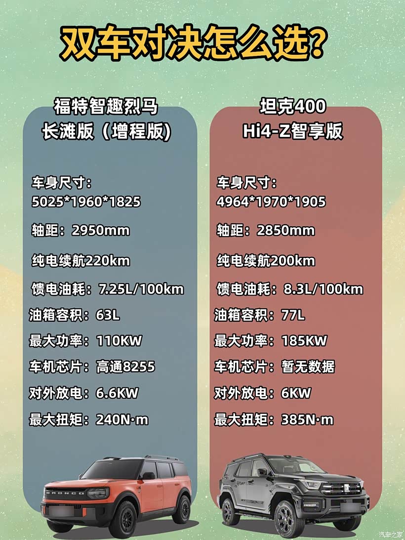 俩车各有偏向,看重续航、油耗和车机配置选烈马,想要动力和油箱就选坦克400?