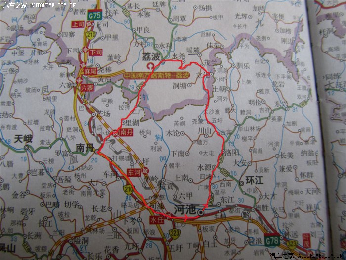 启程之前查看地图研究了一下路线,我们决定从河池出发,通过环江县的洛阳镇进入贵州的立化、茂兰、水尧到达荔波县城,返程时取道离小七孔景区不远的王蒙乡进入广西南丹县境内,然后返回河池。