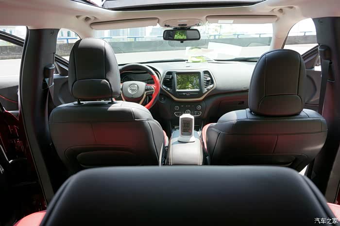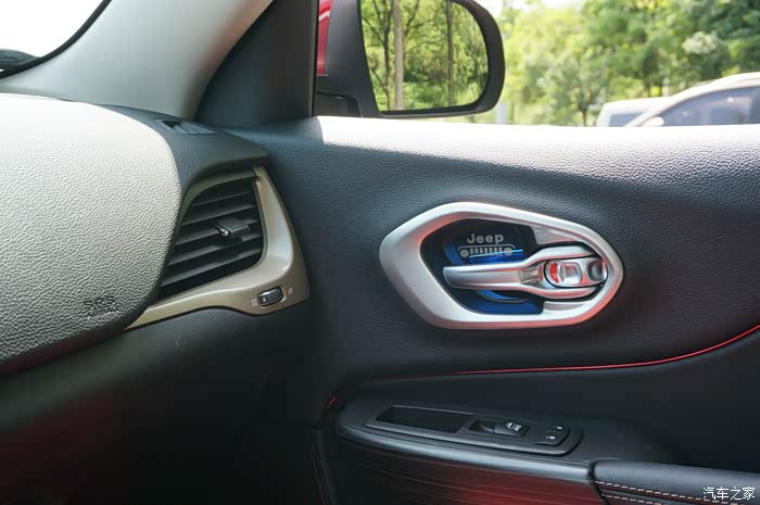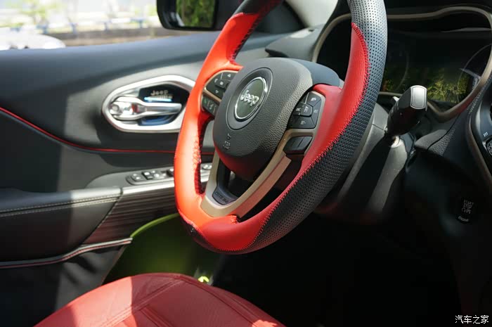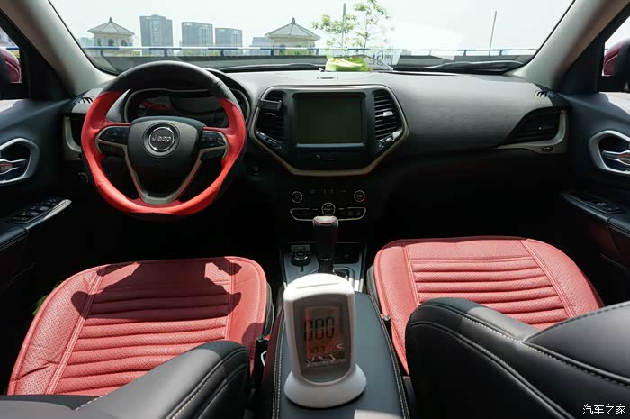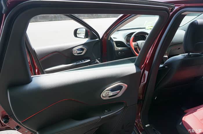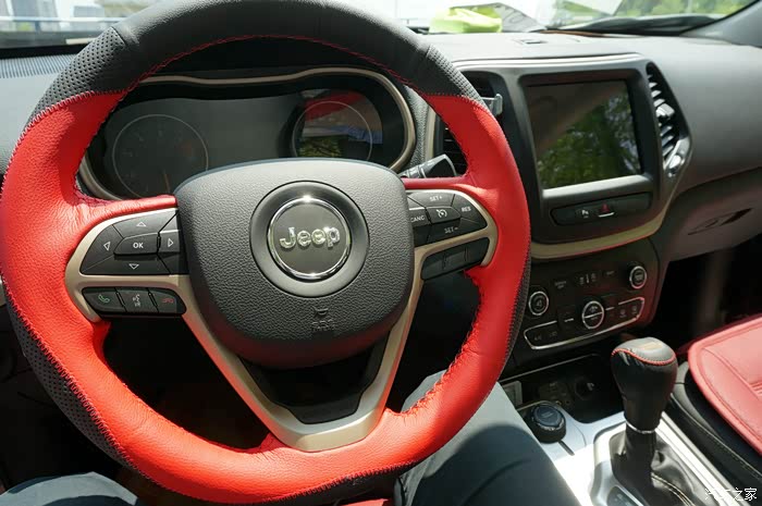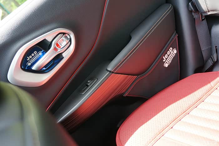 内饰我的是全黑,4S说厂家随机配色,我也就没选。不过我觉得全黑也不错,尤其是陪红色的车身,视觉效果还是很好的,反而色彩多了我感觉太乱。材质用料也不错,能碰到的地方都是软的,也比较精致,缝线我觉得还是比较好看的。全景天窗很大,我并没有碰到异响,路况再颠簸都没有响,可能是三月份之后的车子改进了吧。好吧,座椅底下就不要看了,方向盘和手套箱底下也就不要看了。低速抖动我没有遇到,跟天窗异响一样,都没有,可能是厂家改进了。原厂Uconnect其实还是很好用的,语音识别率比较高,蓝牙连接很快,收音机我用的少,但是能肯定我的没有杂音。唯一就是地图更新慢,不过车载导航能够投射到仪表盘,这个比较风骚,也很实用。据说要发布新版Uconnect,可以支持carplay,期待。