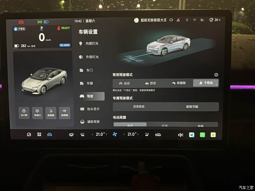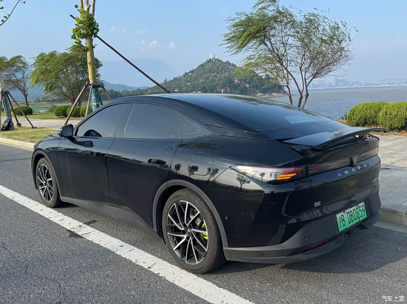 当初选这款车,外观占了很大一部分原因。极狐阿尔法S5的外观不属于那种张扬浮夸的类型,而是偏简约大气的风格,车身线条很流畅,溜背造型不突兀,既保留了轿车的优雅,又多了一丝运动感。前脸的贯穿式灯带很有辨识度,晚上点亮后质感拉满,车尾的小鸭尾设计也很精致,搭配19英寸的轮毂,整体比例很协调,不管是男生开还是女生开,都不会显得违和。车漆质感也不错,我选的是星耀灰,耐脏又显高级,平时一个月洗一次车,依旧很有光泽。