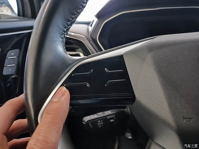 这款车的方向盘上的多功能按键采用可触控式的,平整性不错,虽说这种设计高级有余但触感一般,虽说按键上有刻意的突起加持,但是不太适合盲操。