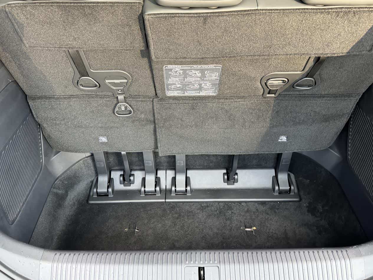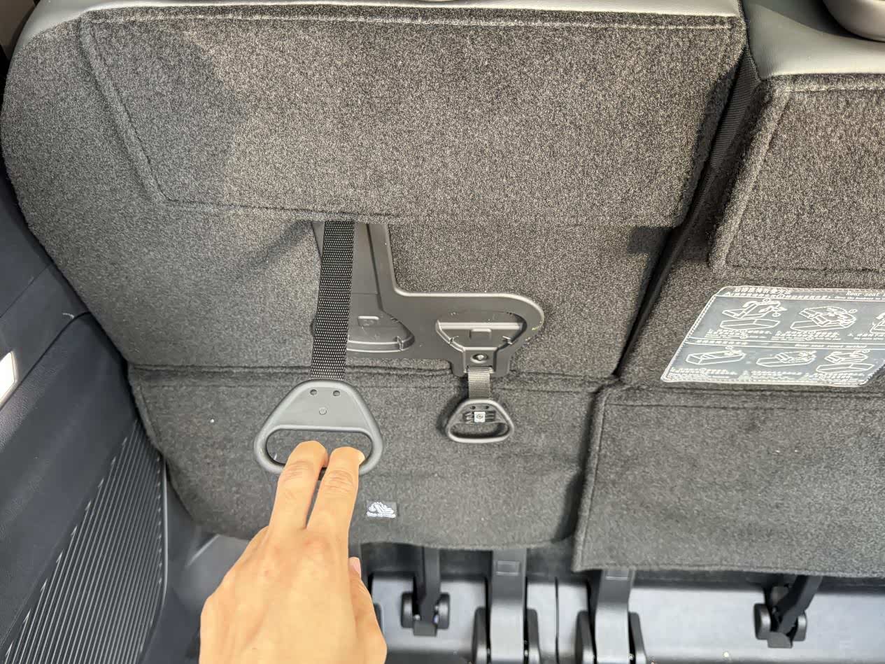 如果还要搬运更多、更大的东西,还可以把第三排的座椅放倒,从后备箱这里直接拉座椅背后的拉环就行,非常方便,不需要走到座椅前面去弄。