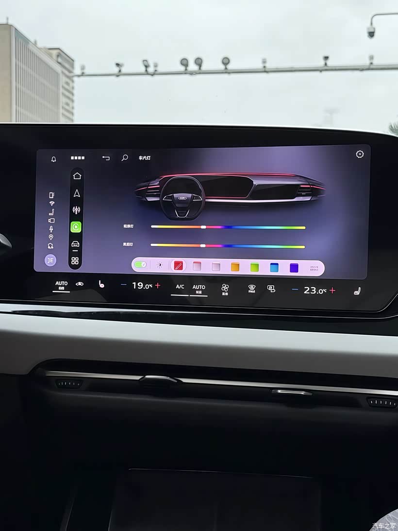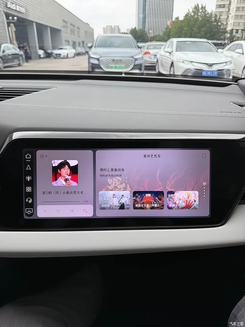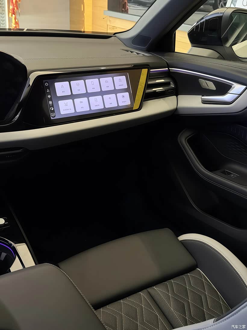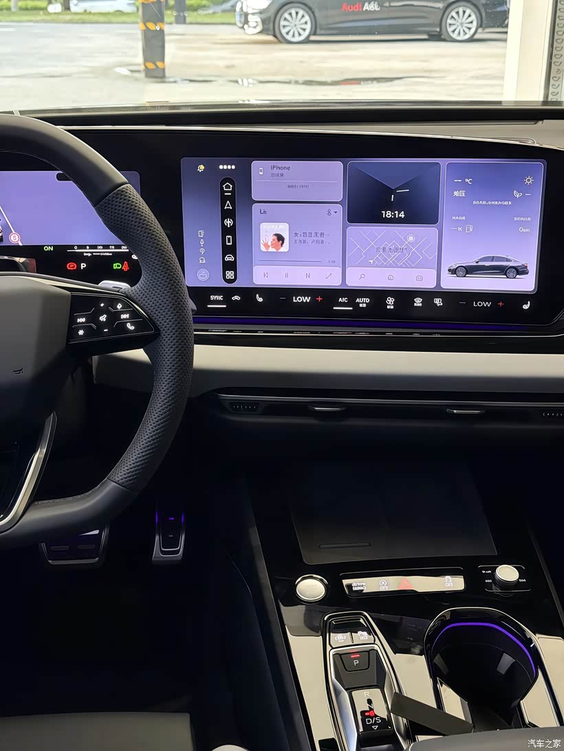 车内的设计其实跟上汽奥迪A5L没什么太大区别,三块屏幕,中间这一块是一个14.5英寸的OLED屏幕,它的清晰度和刷新率我觉得要比之前的版本要好用很多,而且里边搭载了一些比较常规的APP,有微信,全民听歌等等,也可以在里面看电影,应用市场的app还是很多的,副驾驶这块屏幕其实跟中控屏它的使用逻辑其实是一样的,没什么太大区别。仪表屏采用了一个11.9英寸的全液晶仪表!