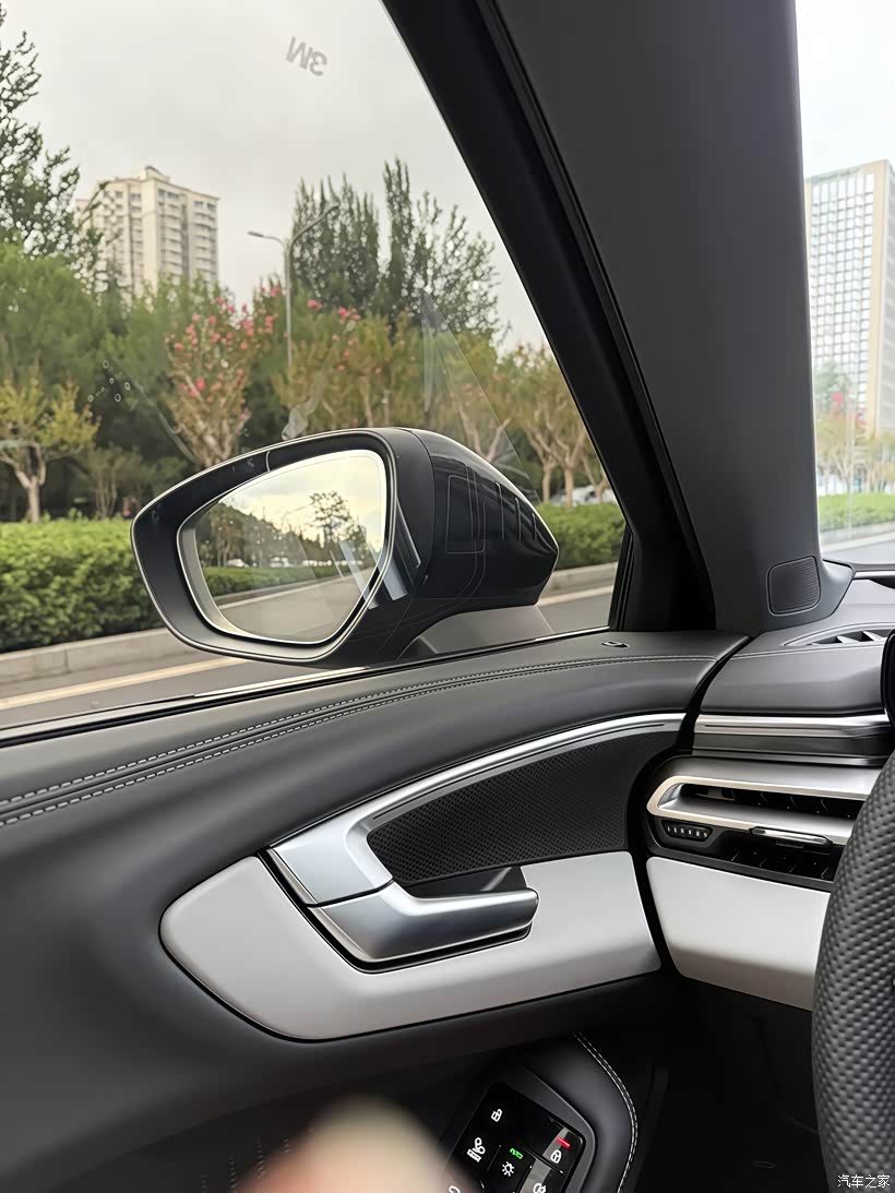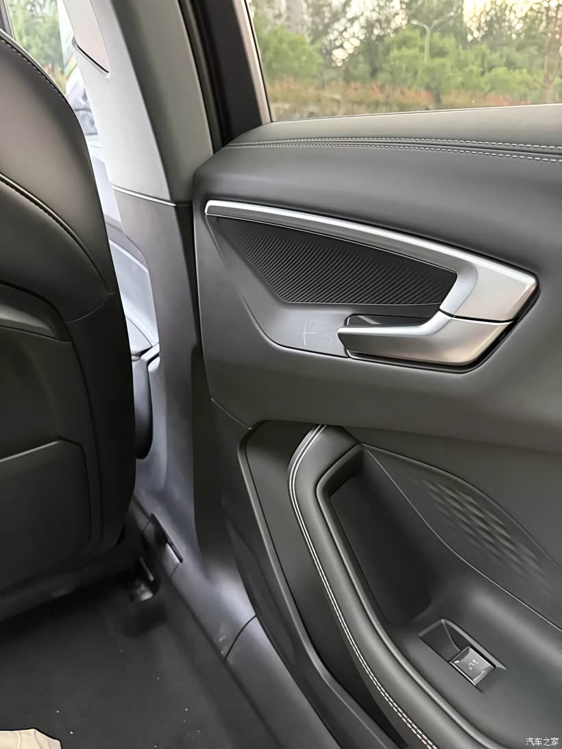 车内的门把手采用了一个电子和机械融合的设计,这点是我比较喜欢的,开门轻轻一掰,它就是一个电子开关。如果说遇到紧急情况了,用力掰一下里面第二个卡扣,就是一个机械式开启的开关。然后在门板的这个位置也设置了一些功能性的按键,调节灯光,后视镜,以及后排的儿童锁都在这里调节。