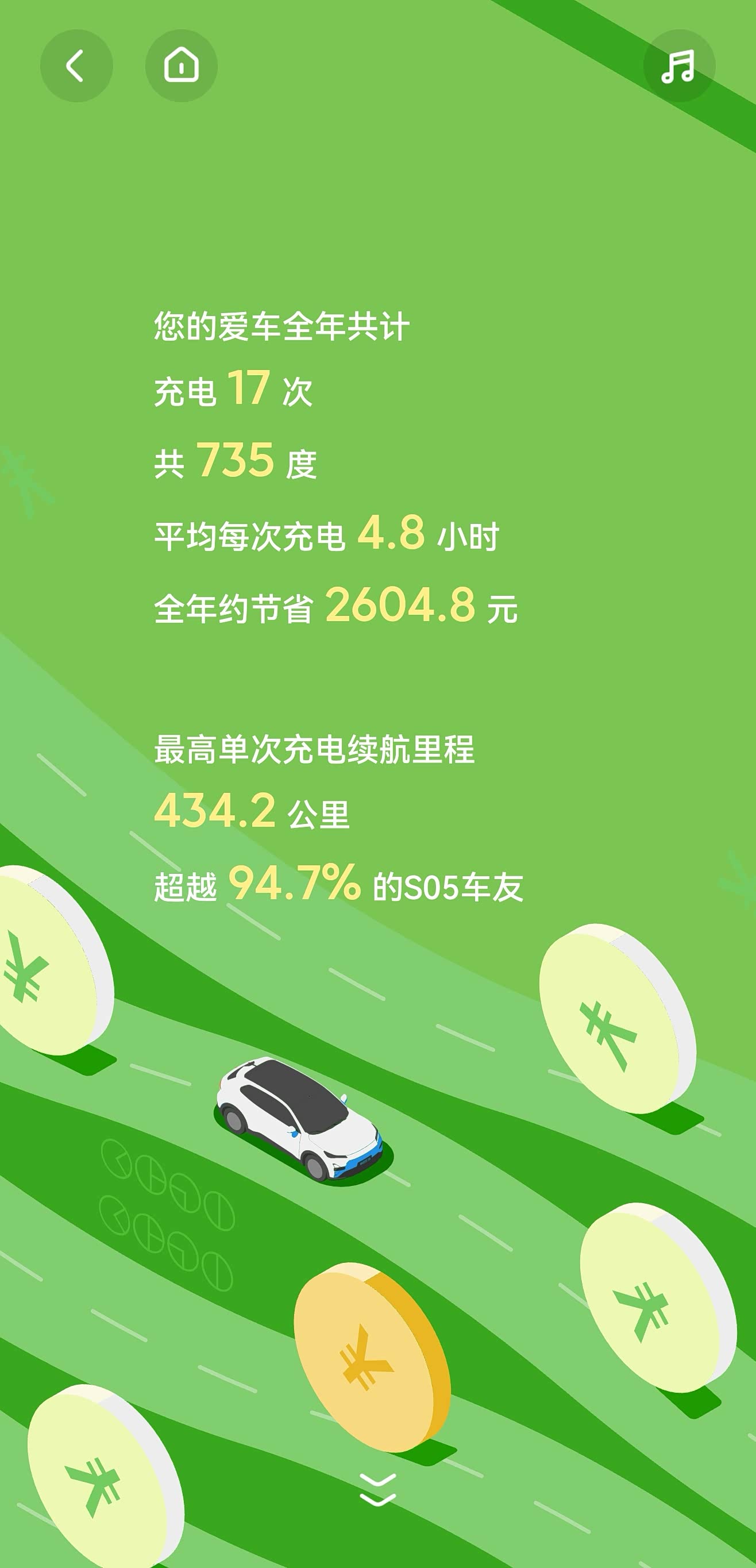 这108天里,我开了99天车,算下来平均电耗才11.5,充过17次电,最高一次跑过434公里。能耗排名超过了86%的S05车友,环保数据也挺欣慰——相当于默默种了18棵树。比起油车,大概省了小三千块钱,够带孩子吃好几顿大餐了。