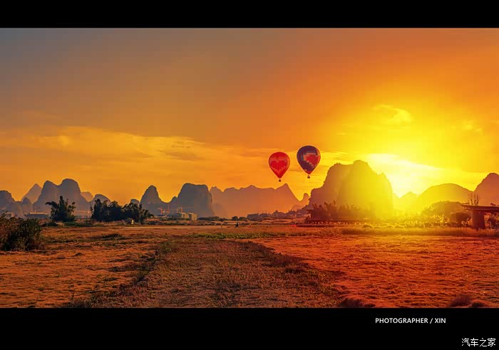 夕阳余晖下的阳朔燕莎航空运动营地,如果此时你正在热气球上,就可以欣赏到最美日落了!